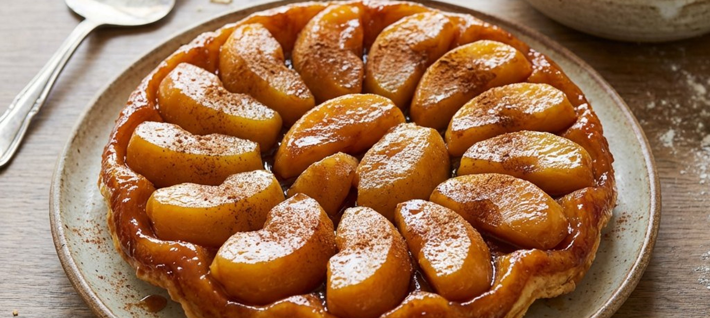 - 4Die Tarte für ca. 20–25 Minuten backen, bis der Teig goldbraun und knusprig ist. Die Pfanne aus dem Ofen nehmen, kurz abkühlen lassen und dann vorsichtig auf eine Servierplatte stürzen, sodass die karamellisierten Äpfel oben liegen. Warm servieren.