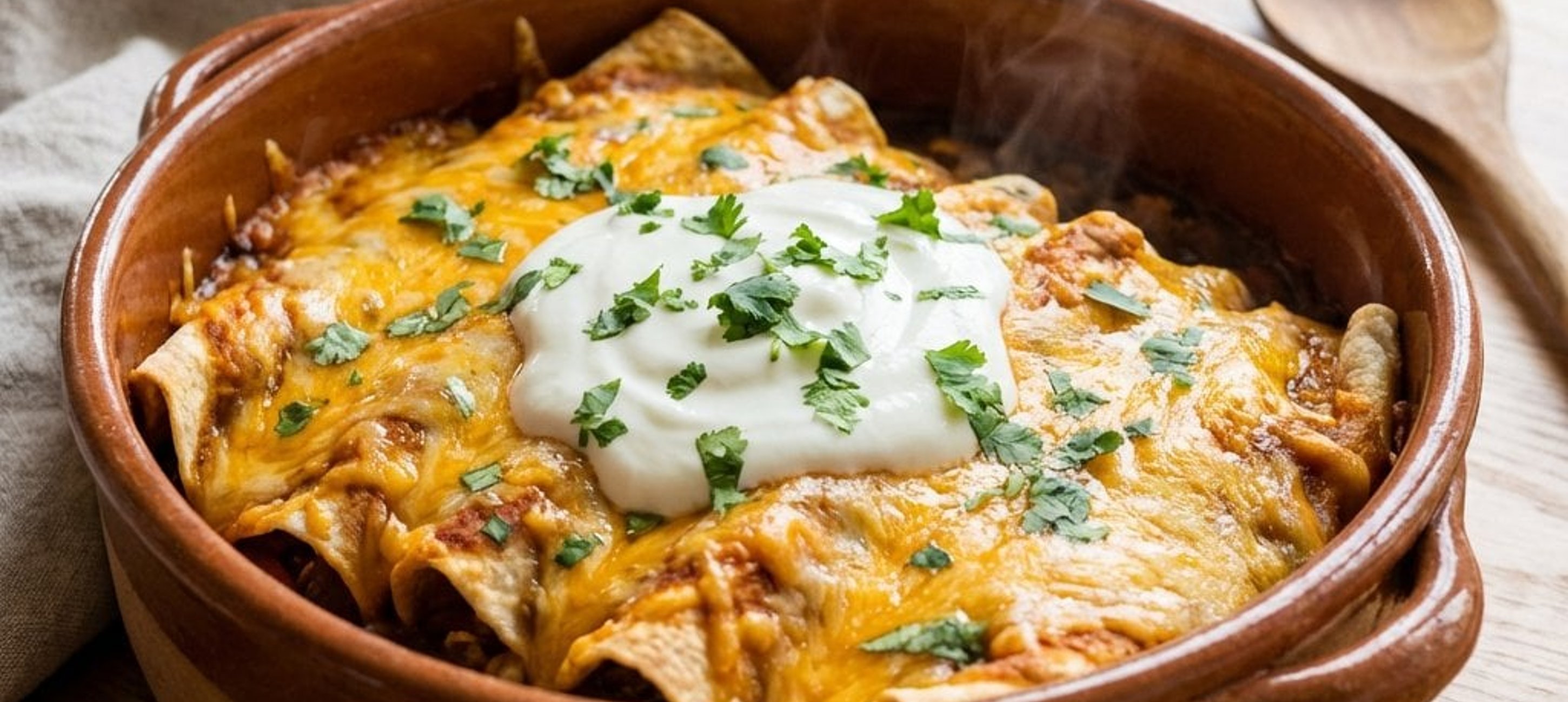 Serviere die Enchiladas mit einem Klecks Sauerrahm und frischem Koriander für noch mehr Frische!