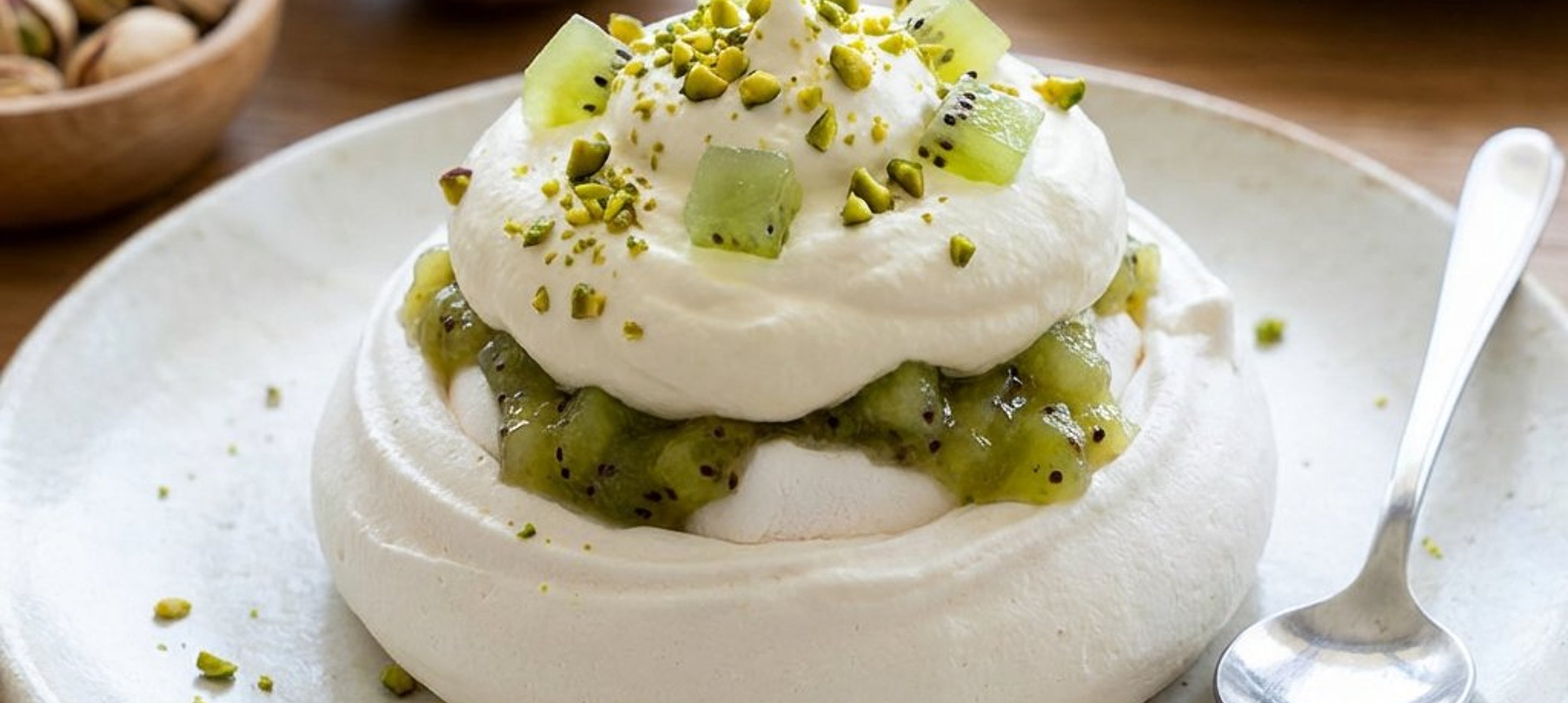 - 1Das Schlagobers steif schlagen. Das Kiwi-Kompott in die Pavlovas füllen, Schlagobers darauf verteilen und mit Gelee-Würfeln, frischen Kiwi-Scheiben und gehackten Pistazien garnieren. Sofort servieren.