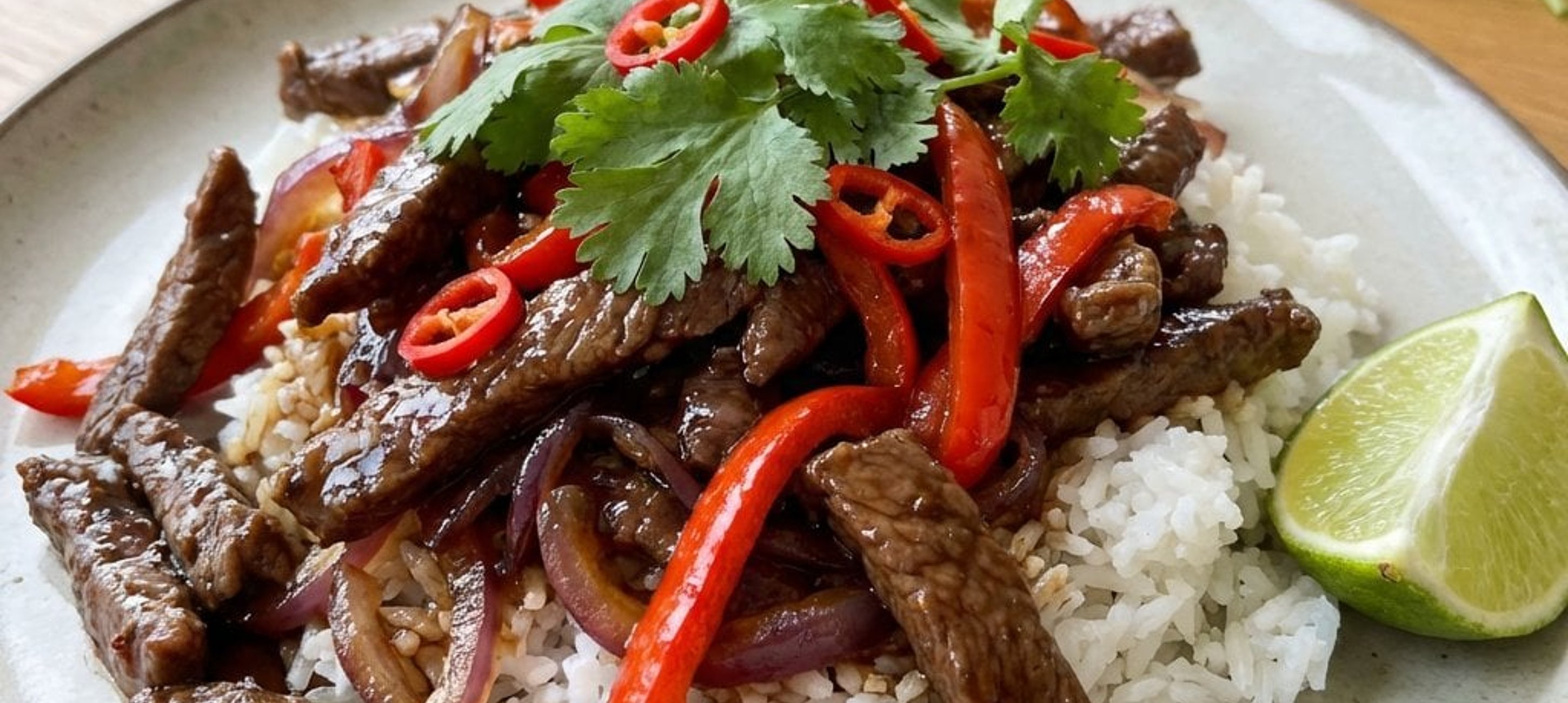 - 1Die Rindfleisch-Pfanne zusammen mit dem Jasminreis servieren. Mit frischem Koriander bestreuen und mit Limettenspalten zum Beträufeln garnieren.