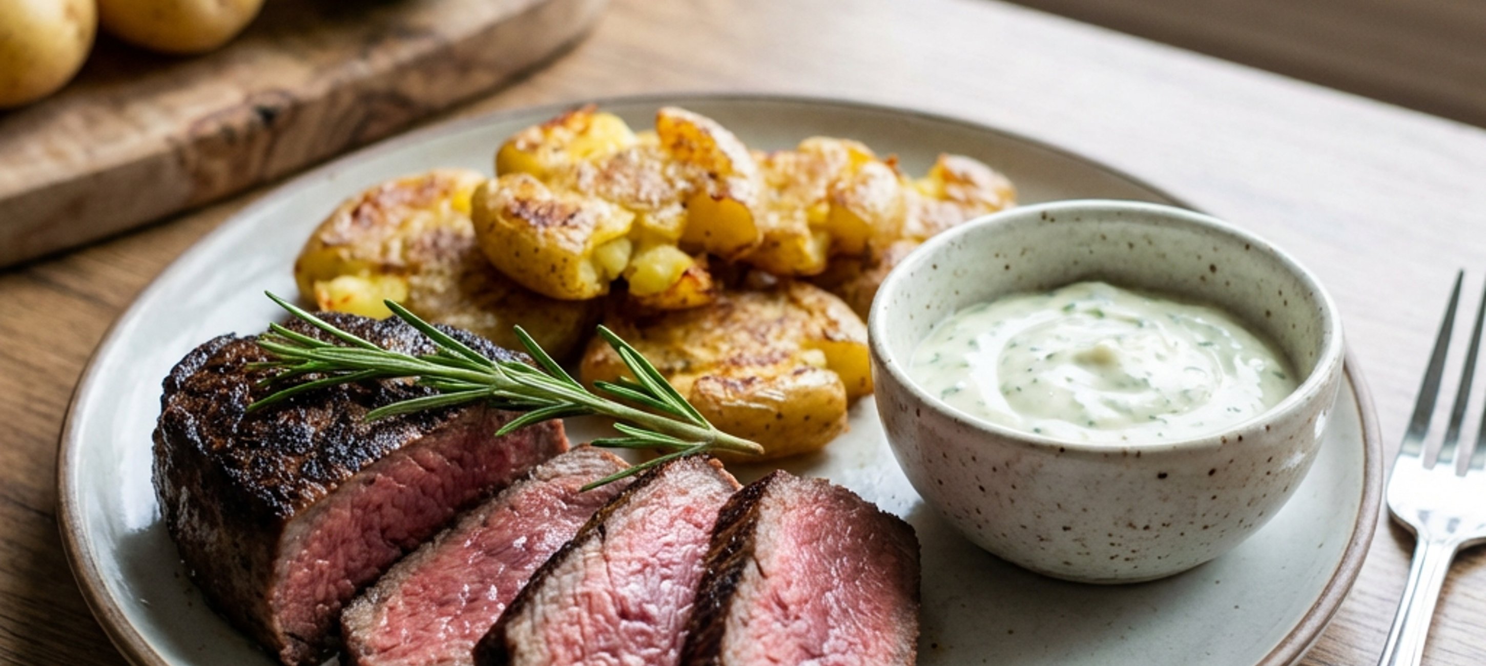 - 1Das Steak auf Zimmertemperatur bringen, mit Olivenöl einmassieren, salzen, pfeffern und ruhen lassen. In der Zwischenzeit die Kartoffeln 10 Minuten vorkochen, dann auf ein mit Backpapier ausgelegtes Backblech legen und mit einem Glas flach drücken. Mit Kartoffelgewürz bestreuen, mit Olivenöl beträufeln und im Ofen bei 220°C ca. 10 Minuten knusprig backen.