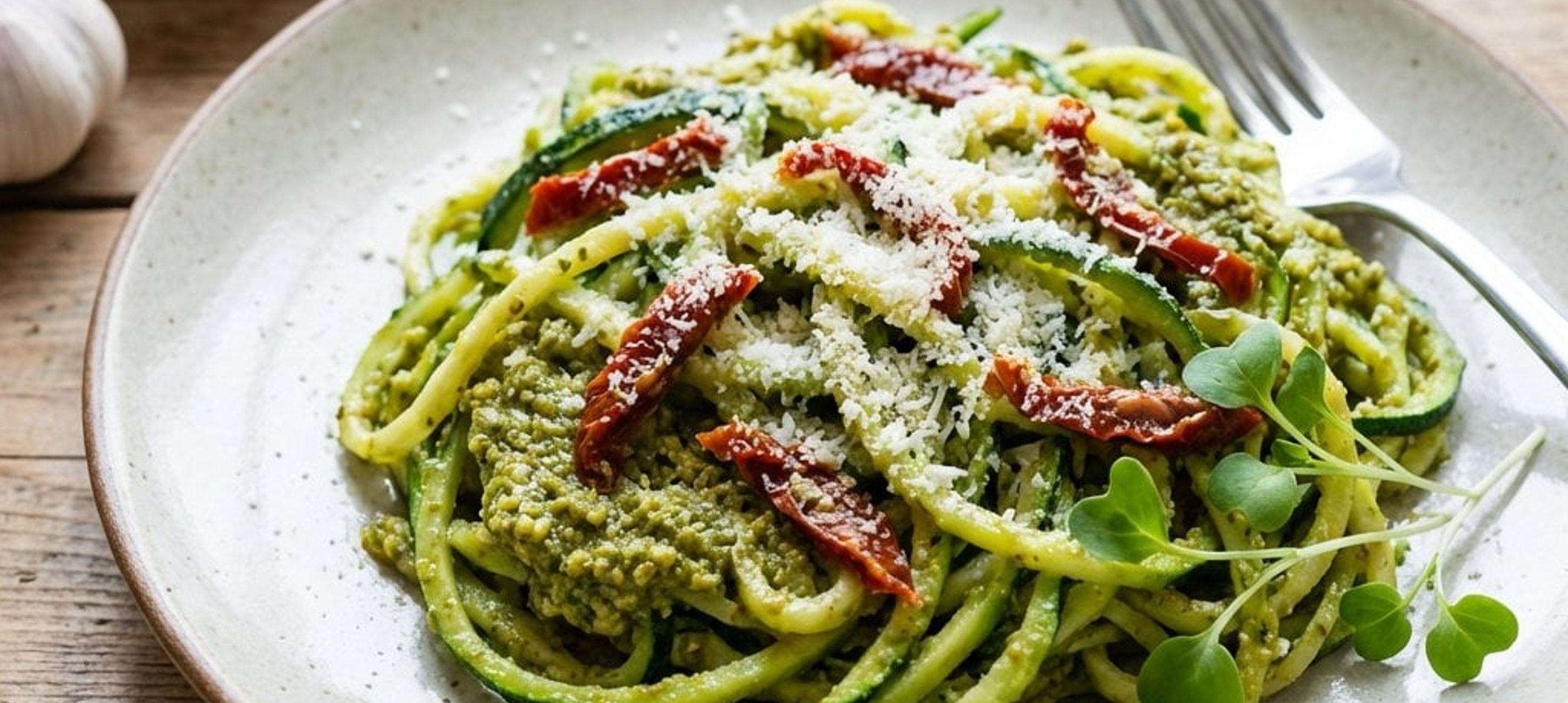 - 4Das Pistazienpesto und die klein geschnittenen getrockneten Paradeiser vorsichtig unter die Zucchini-Nudeln mischen. Mit frisch gemahlenem Pfeffer abschmecken.