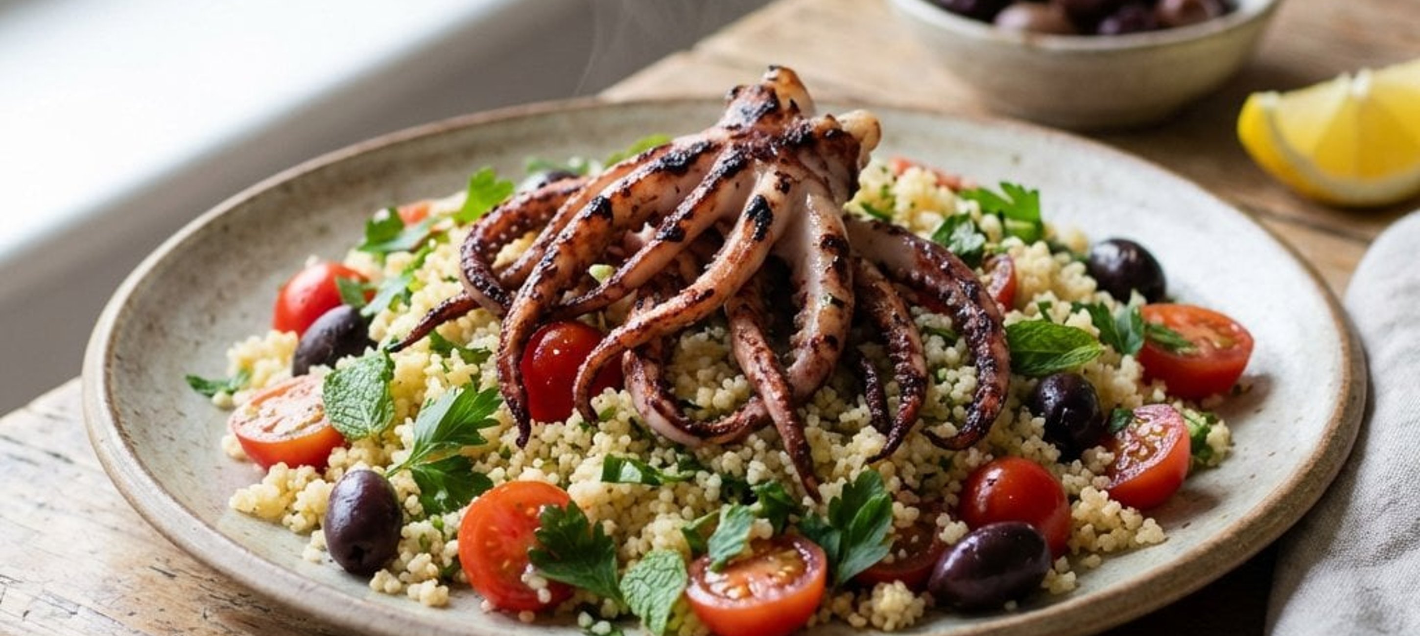 - 2Auf den Tellern zuerst den Couscous und den Wildkräutersalat anrichten. Darauf das gebratene Gemüse mit den Kalamari-Stücken verteilen. Zum Schluss mit frischem Zitronensaft und dem restlichen Olivenöl beträufeln und mit gehackter Petersilie garnieren.