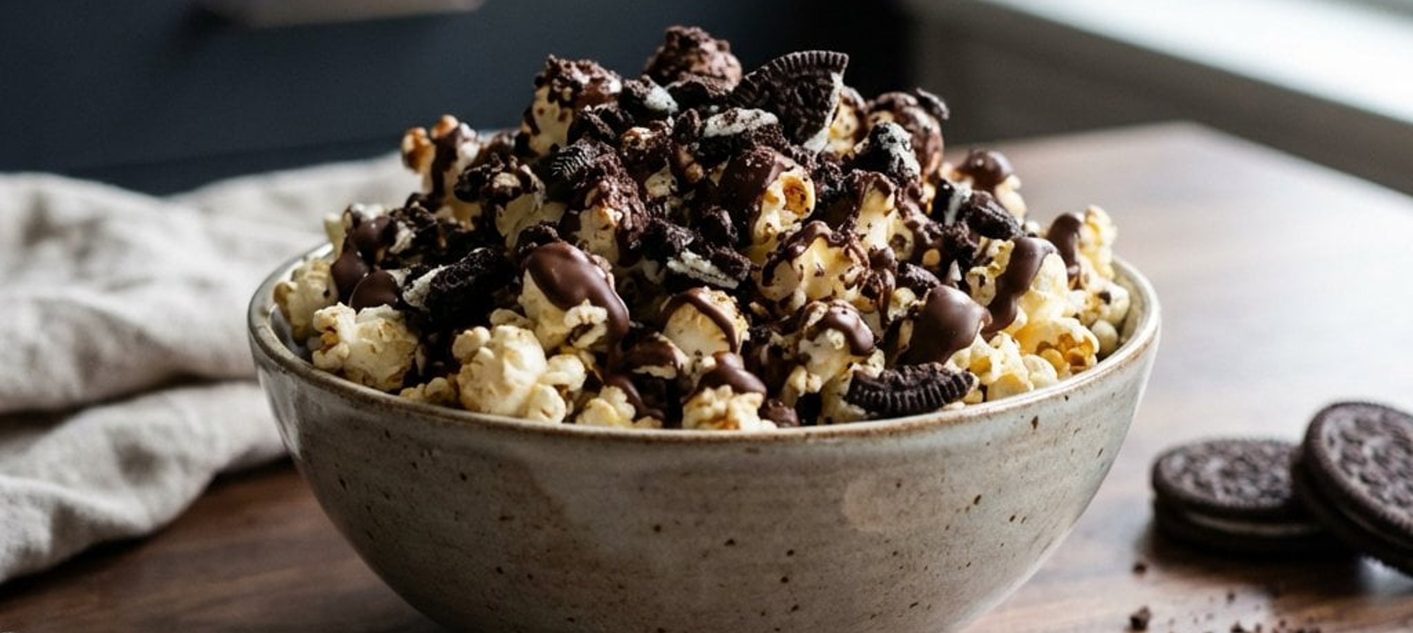 - 7Das fertige Oreo Popcorn vollständig auskühlen lassen. In Schüsseln anrichten und vor dem Servieren mit den restlichen groben Keksstücken bestreuen.