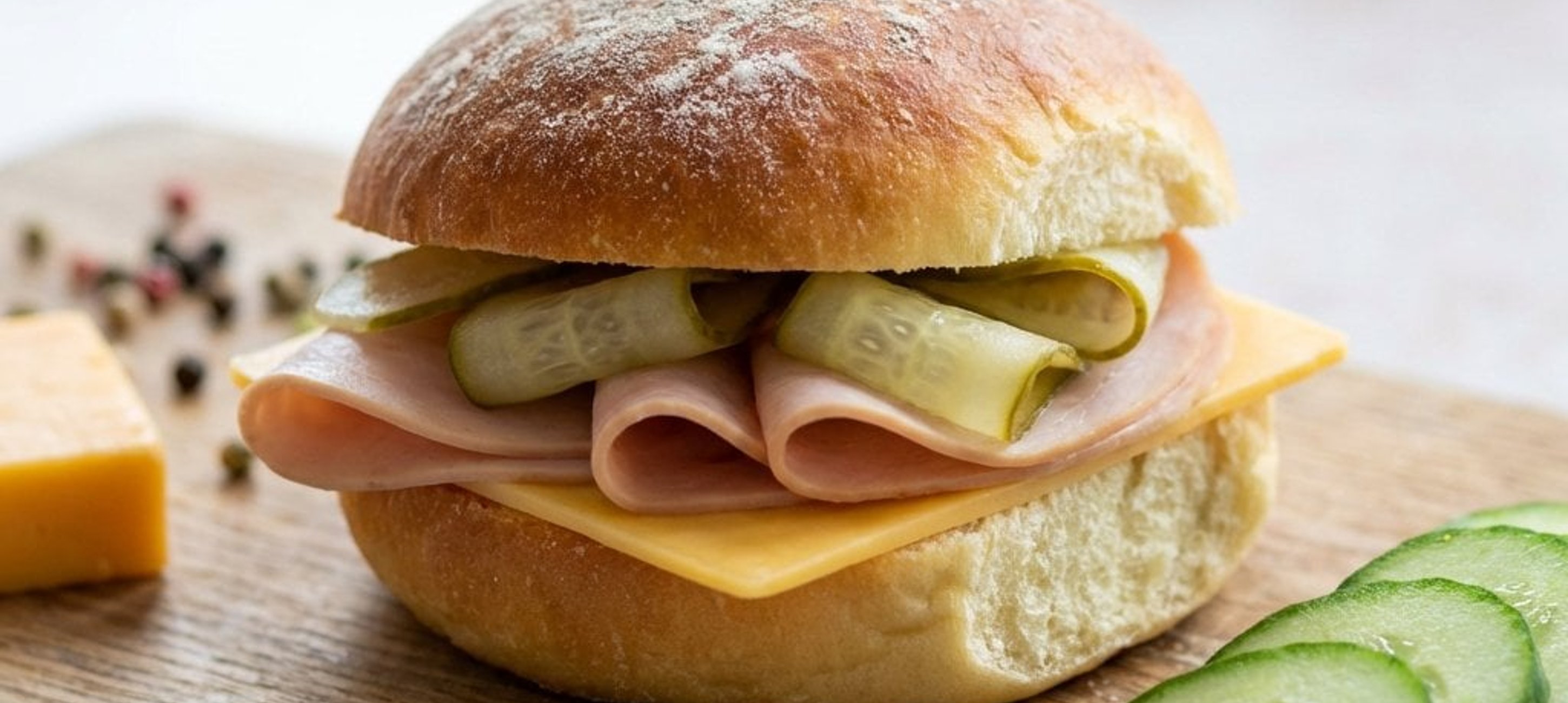 - 4Jede Semmel mit Putenschinken, Cheddar und den abgetropften Gurkenstreifen füllen. Deckel drauf und genießen!