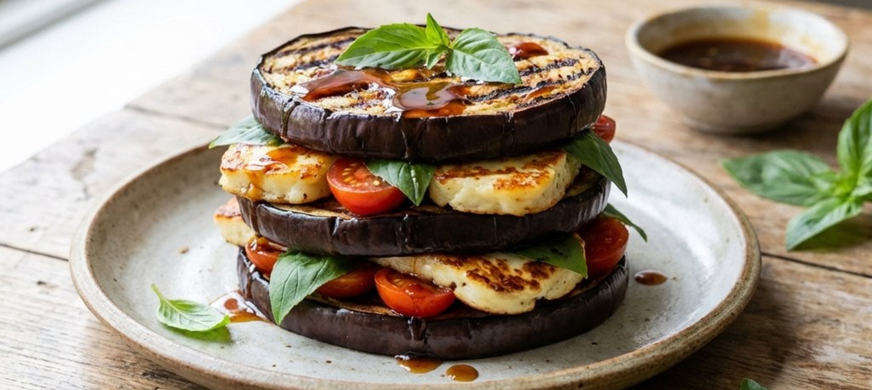 - 5Zum Anrichten jede Melanzani-Scheibe leicht salzen, mit etwas Vogerlsalat belegen, die vorbereitete Teriyaki-Gemüsemischung darauf verteilen, eine Scheibe Halloumi darauflegen und with einer zweiten Melanzani-Scheibe abdecken. Warm servieren.