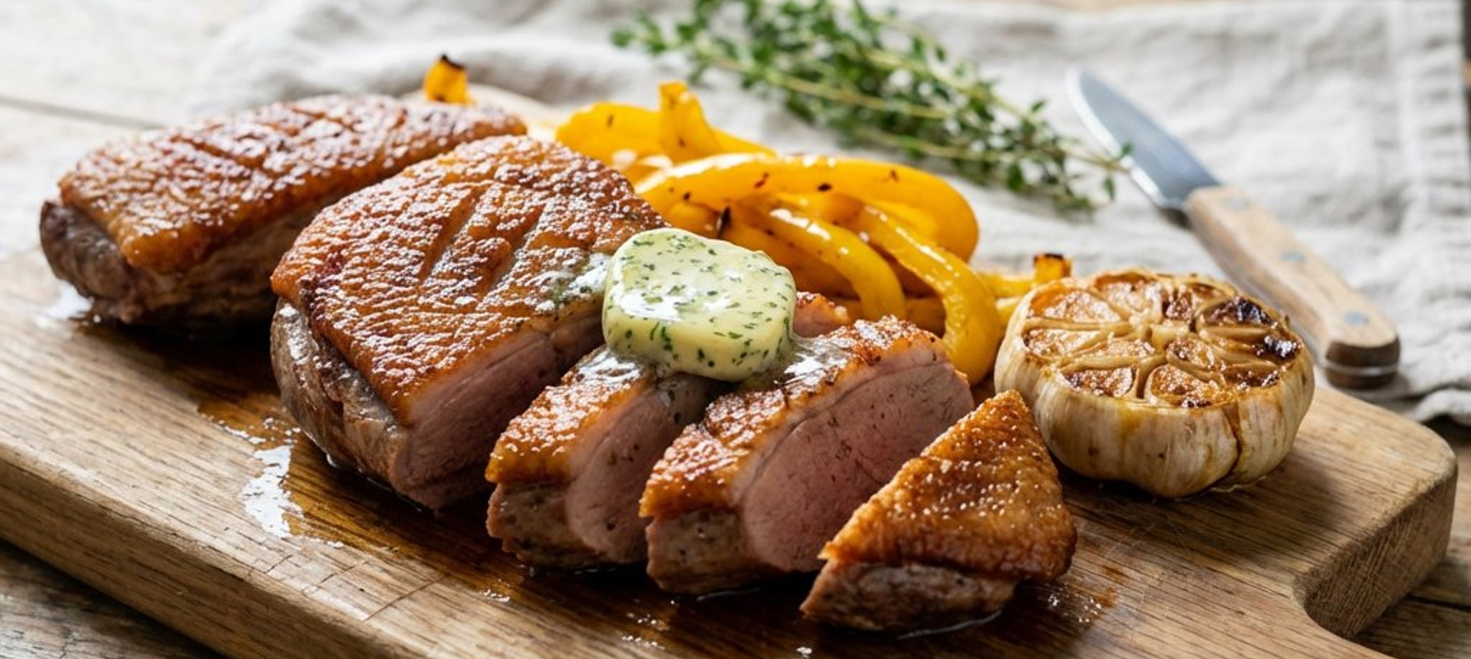 - 8Das Fleisch nach der Ruhezeit in dünne Tranchen schneiden, mit Himalayasalz bestreuen und zusammen mit der gerösteten Paprika und dem gegrillten Knoblauch servieren.