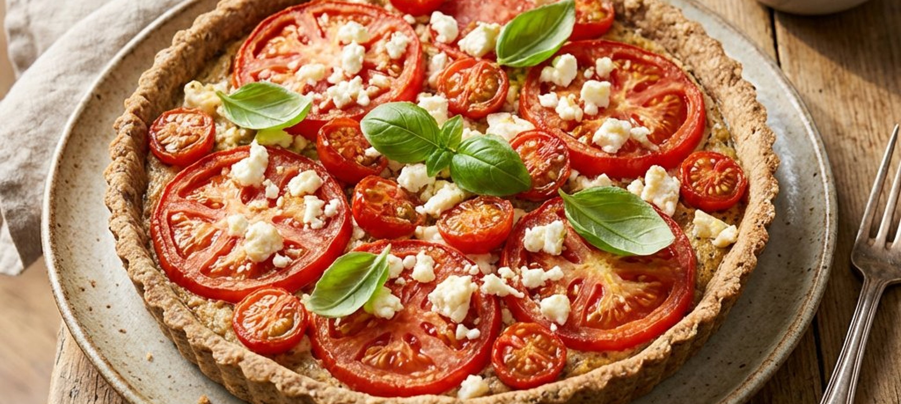 - 6Sobald der Boden vorgebacken ist, aus dem Ofen nehmen. Die Sauerrahm-Käse-Mischung gleichmäßig darauf verteilen und mit den Paradeiserscheiben belegen. Zurück in den Ofen schieben und ca. 50 Minuten goldbraun backen.