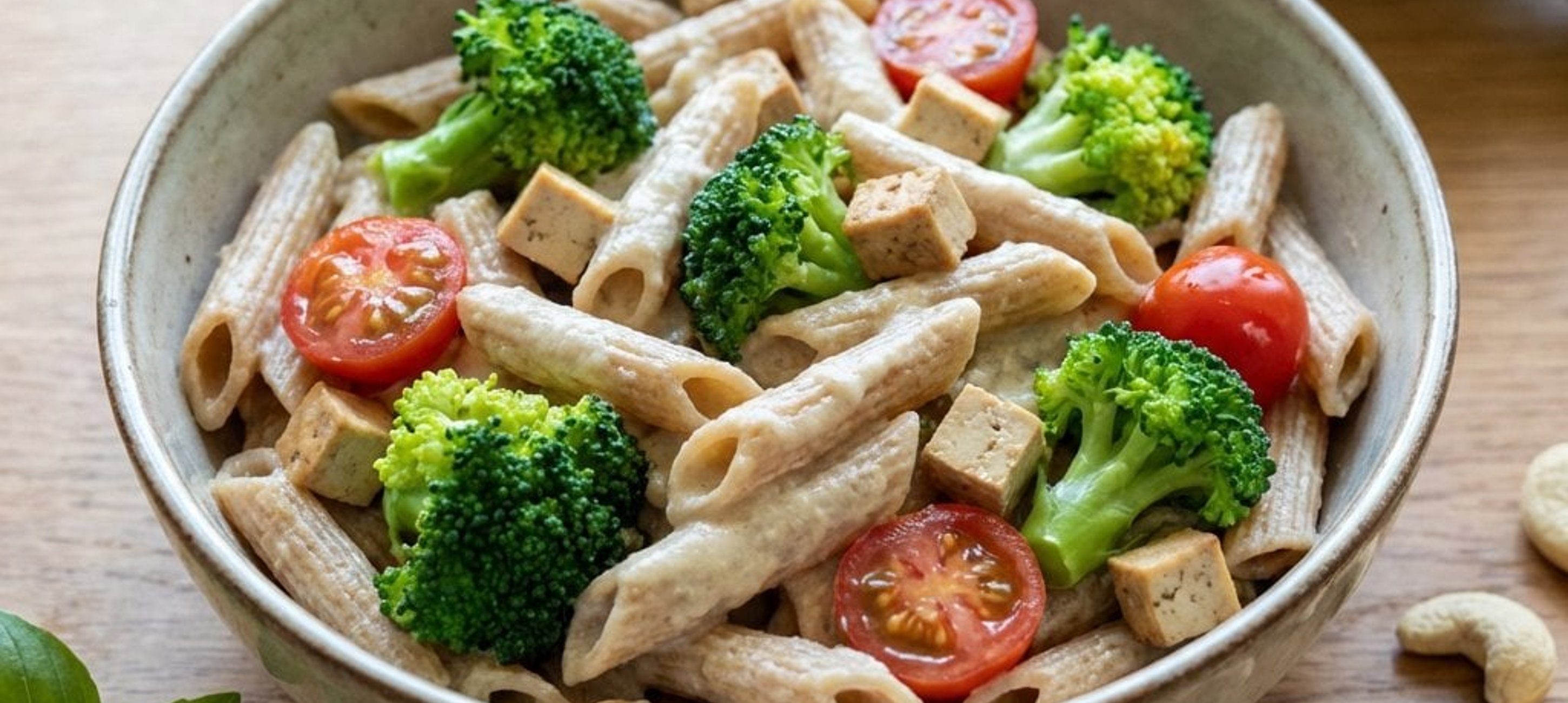 - 3Die fertig gekochte Pasta mit der Cashewsauce vermengen. Brokkoli, Paradeiser und Tofu unterheben, alles vorsichtig durchmischen und sofort servieren.