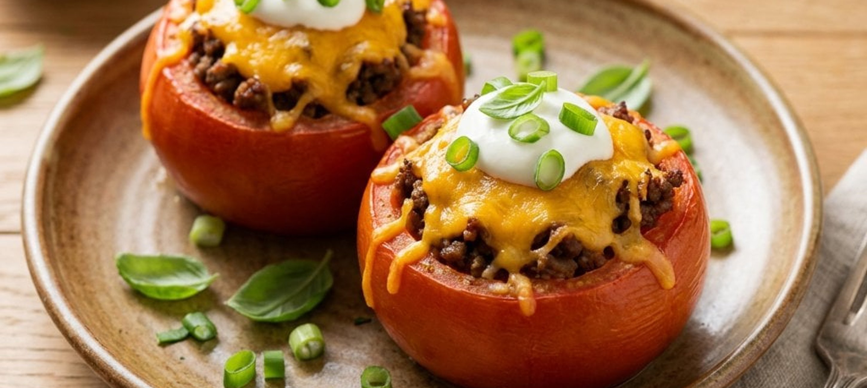 - 3Backen Sie die gefüllten Paradeiser für 15 Minuten bei 160 °C im Ofen. Nehmen Sie das Blech kurz heraus, bestreuen Sie die Paradeiser mit dem geriebenen Cheddar und backen Sie sie für weitere 5–10 Minuten, bis der Käse goldbraun geschmolzen ist. Garnieren Sie die Paradeiser vor dem Servieren mit einem Klecks Sauerrahm und den frischen Jungzwiebelringen. Guten Appetit!