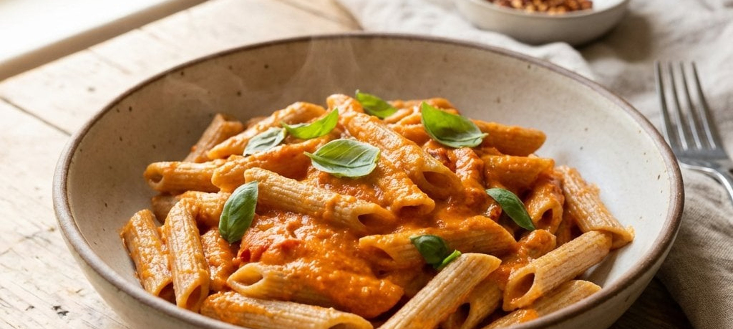- 5Die gekochten Penne zur Sauce in die Pfanne geben, gut durchmischen und auf Tellern anrichten. Sofort servieren.