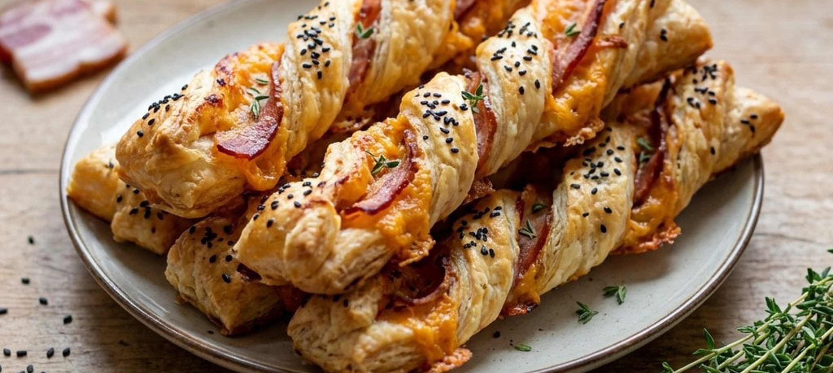 - 4Die Speckscheiben längs halbieren. Auf jeden Teigstreifen eine halbe Scheibe Speck legen. Die Enden der Streifen zusammendrücken, sodass der Speck außen liegt.