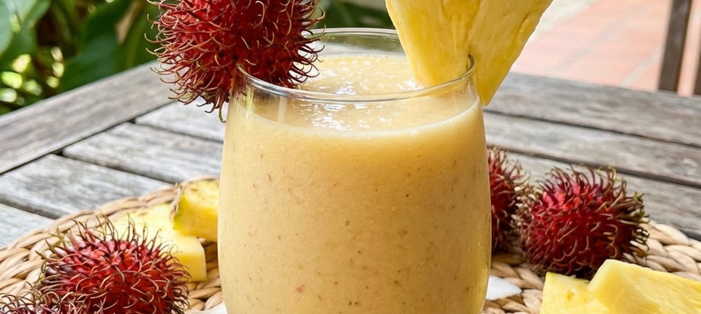Servieren Sie den Smoothie in einem hohen Glas mit einem Strohhalm aus Glas oder Edelstahl für das perfekte Urlaubsfeeling.
