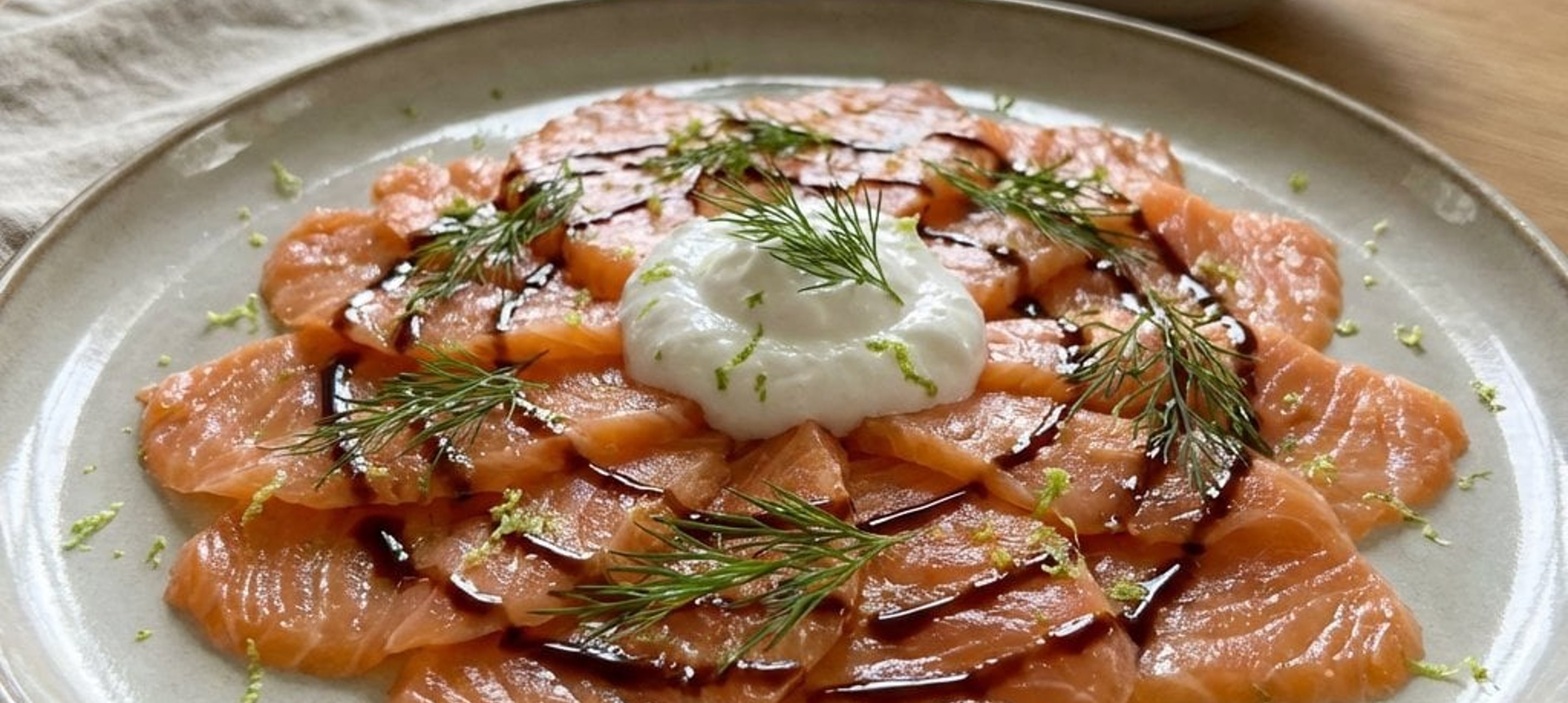 - 2Den frischen Dill fein zupfen und über die Kokoscreme sowie den Lachs streuen. Mit etwas Balsamico-Glace dekorativ beträufeln.
