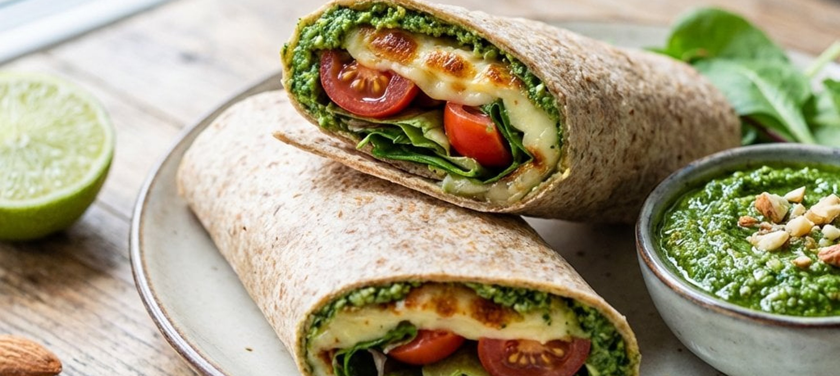 - 4Die Tortillas großzügig mit dem Spinatpesto bestreichen. Den Salatmix und die Paradeiser darauf verteilen und zum Schluss den gegrillten Käse darauflegen.