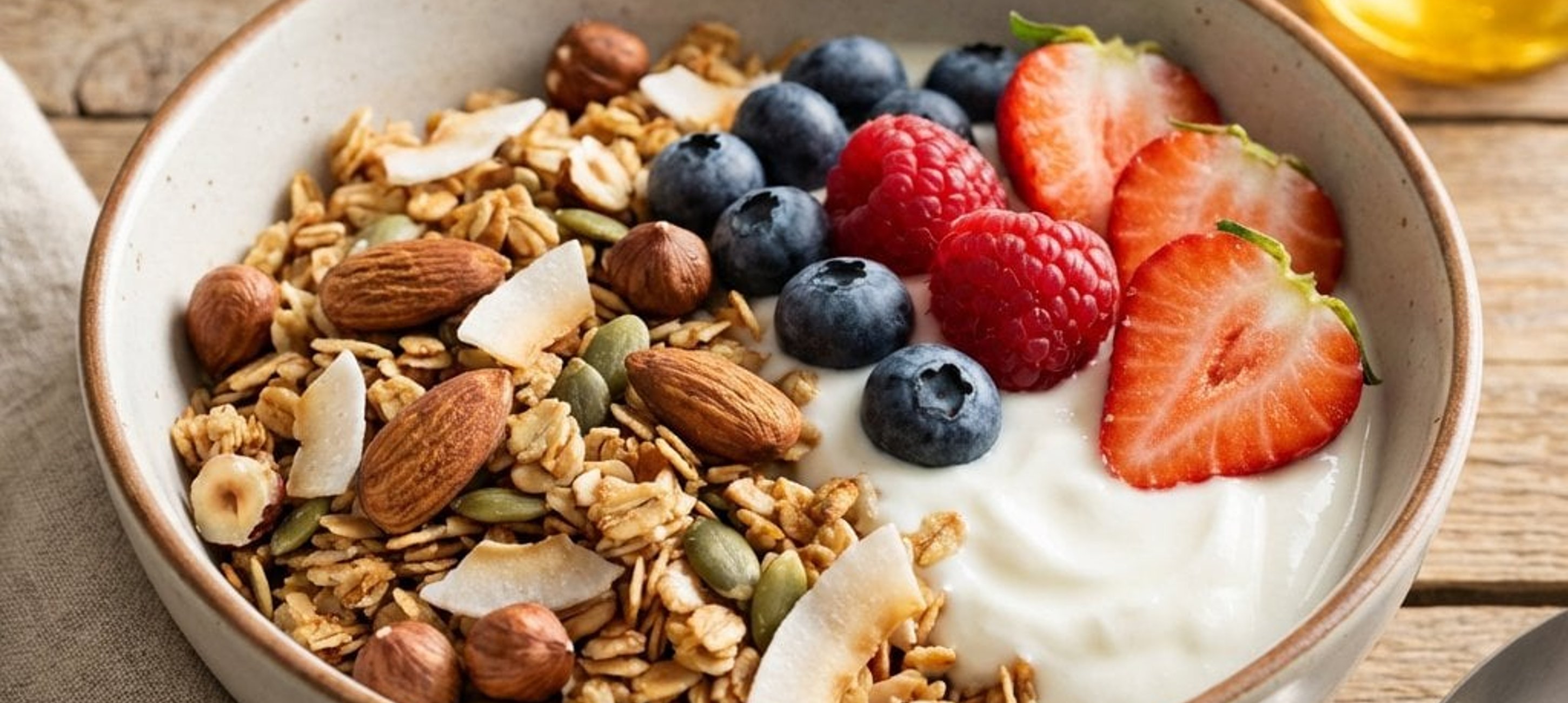 - 4Serviere dein Granola nach Belieben mit Naturjoghurt und frischen Beeren. Für das gewisse Extra kannst du nach dem Abkühlen noch gehackte Zartbitterschokolade oder gefriergetrocknete Früchte unterrühren.