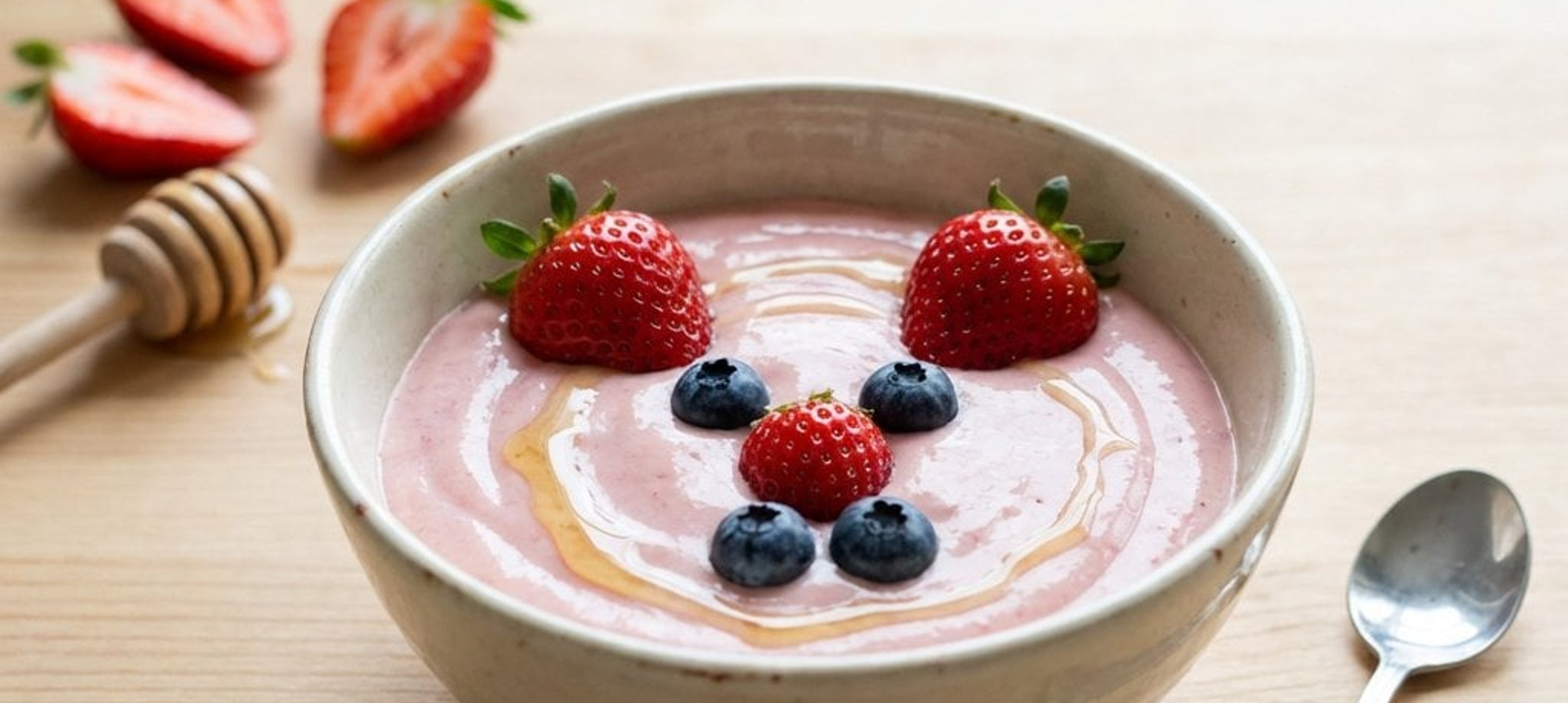 - 3Die Creme in kleine Schälchen füllen. Mit den restlichen Erdbeeren und Heidelbeeren verzieren – zum Beispiel als lustiges Katzen-, Bären- oder Schweinchengesicht. Sofort genießen oder bis zum Servieren kühl stellen.