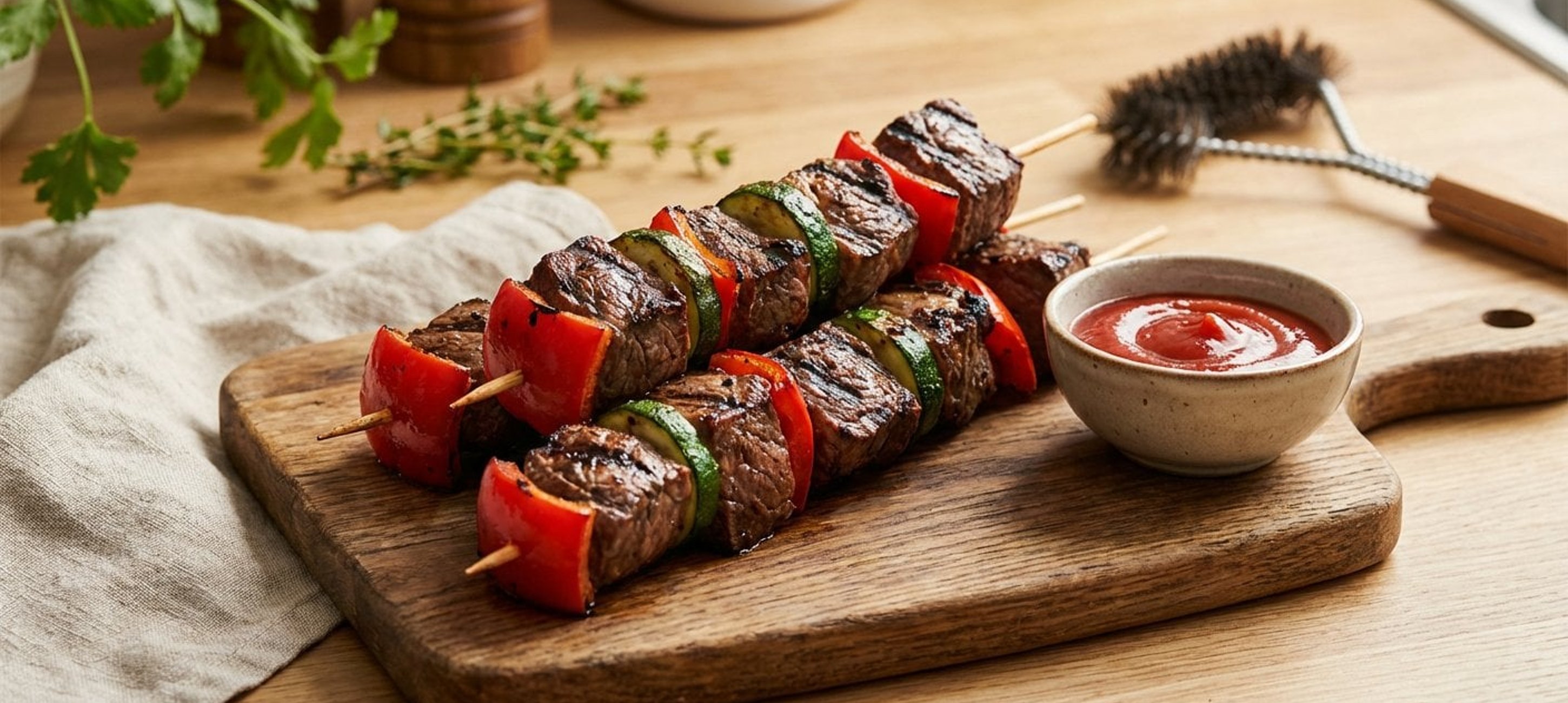 - 4Die fertigen Steak-Spieße mit Heinz Tomato Ketchup und Ihren liebsten BBQ-Beilagen servieren. Guten Appetit!