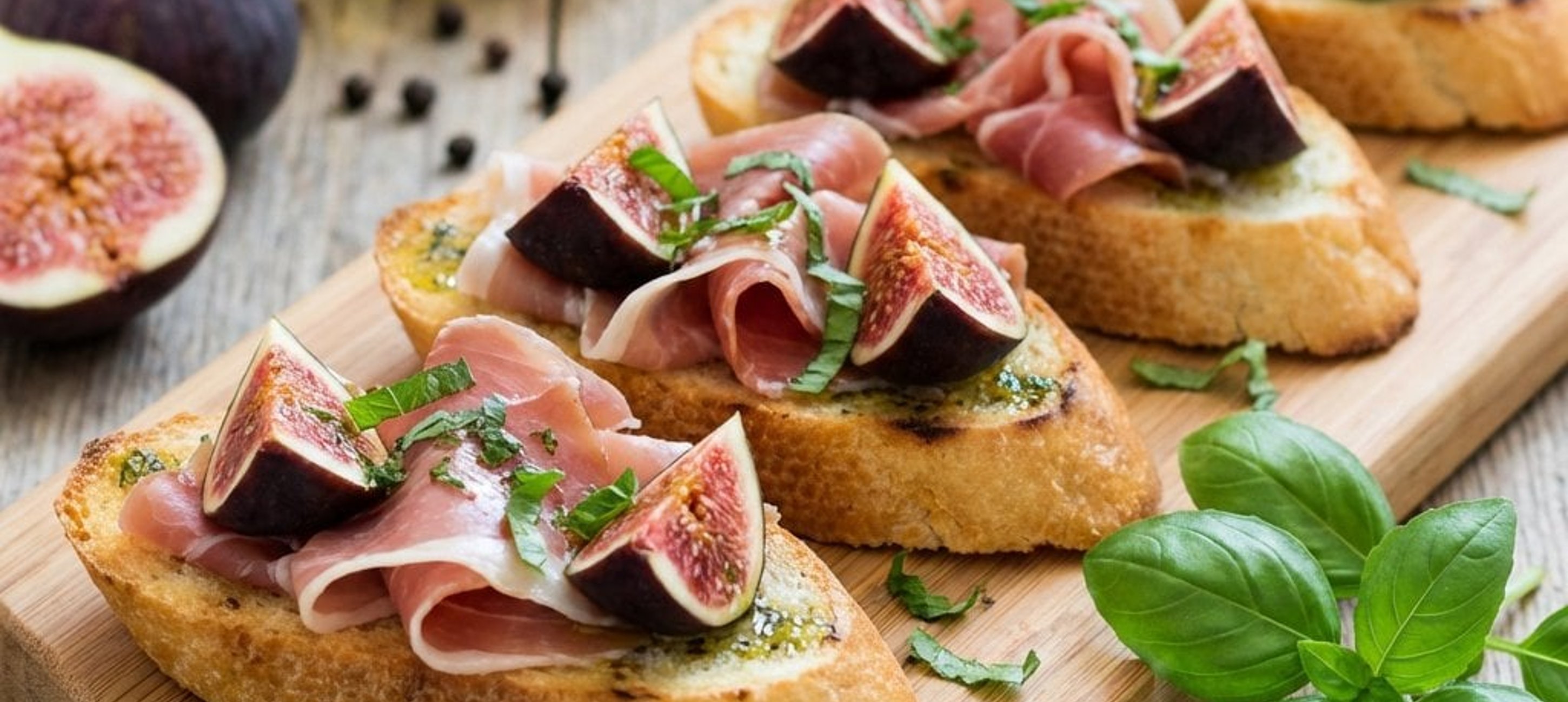 - 5Jedes Crostini mit einer halben Scheibe Prosciutto und einem Feigenviertel belegen. Mit etwas Salz bestreuen, mit dem restlichen Öl beträufeln und mit fein gehackter Minze garnieren.
