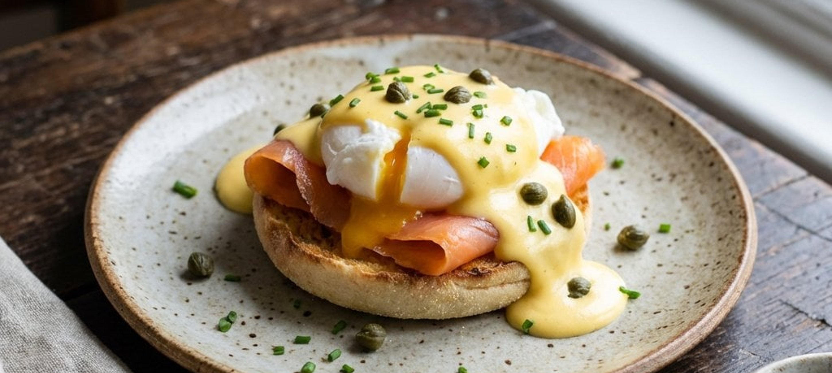 - 4Die pochierten Eier vorsichtig mit einem Schaumlöffel aus dem Wasser heben, kurz abtropfen lassen und auf den Lachs setzen. Großzügig mit Sauce Hollandaise übergießen.