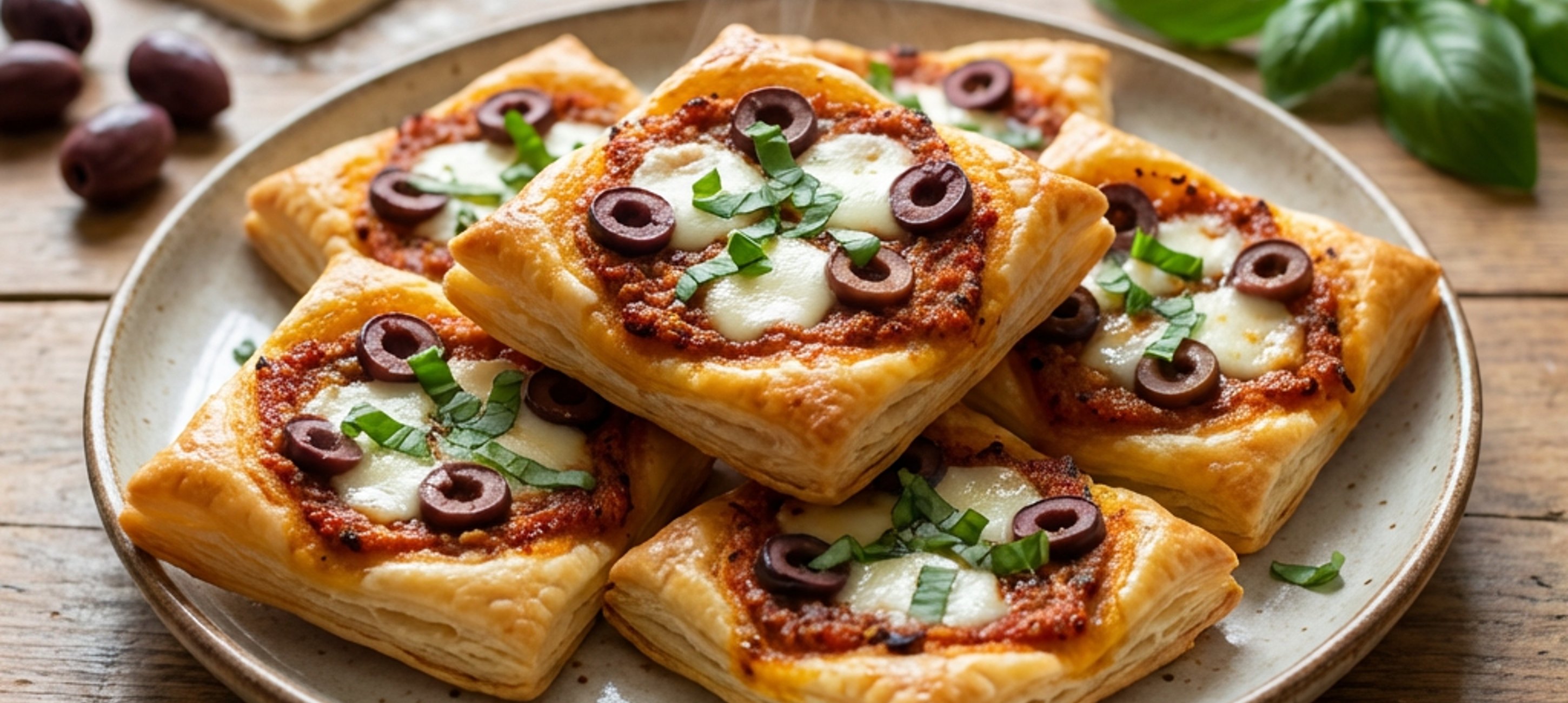 - 3Backrohr auf 180°C Umluft vorheizen. Die Teig-Rechtecke mit Oliven und Mozzarella belegen. Im vorgeheizten Backrohr für 10 bis 12 Minuten backen. Währenddessen die Basilikumblätter grob zerhacken und hiermit die fertig gebackenen Pizzastücke bestreuen.