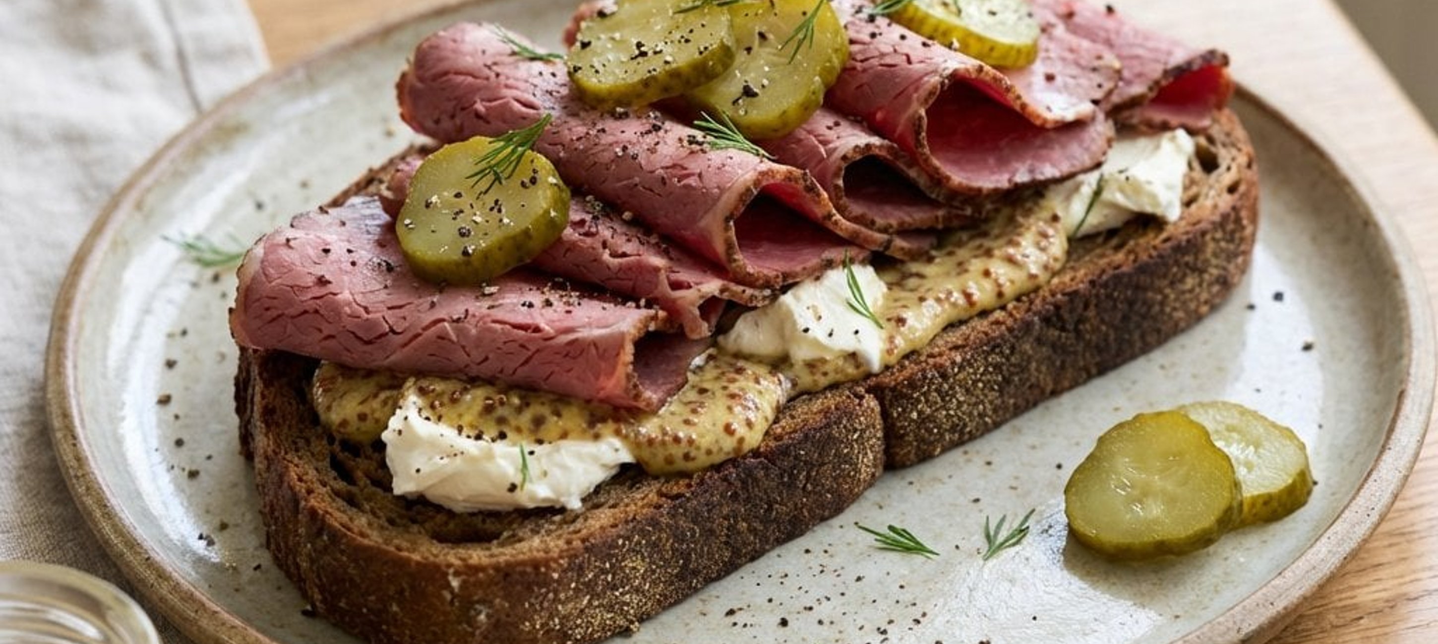 - 3Das Pastrami in lockeren Wellen auf das Brot schichten. Die Essiggurken in feine Scheiben schneiden und dekorativ auf dem Fleisch verteilen. Sofort genießen!