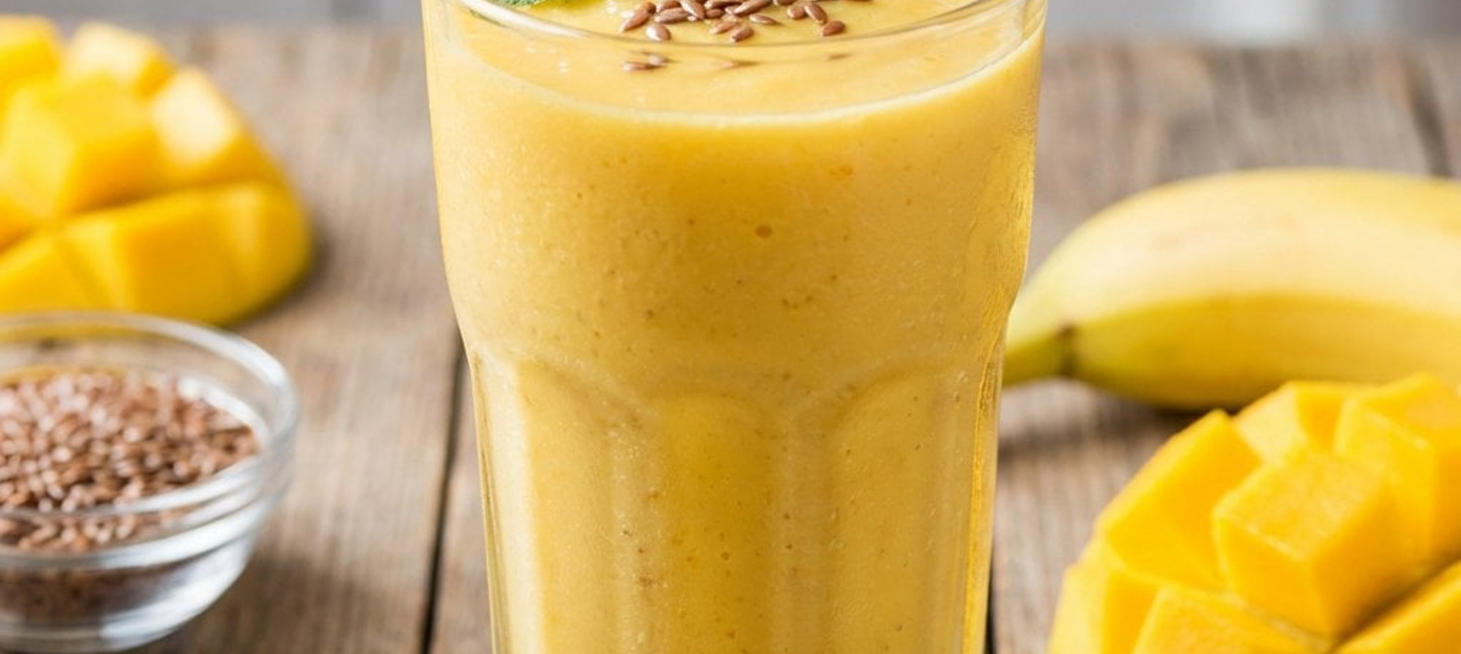 - 1Die Mango schälen, das Fruchtfleisch vom Kern schneiden und in grobe Stücke teilen. Die Banane ebenfalls schälen und stückeln.