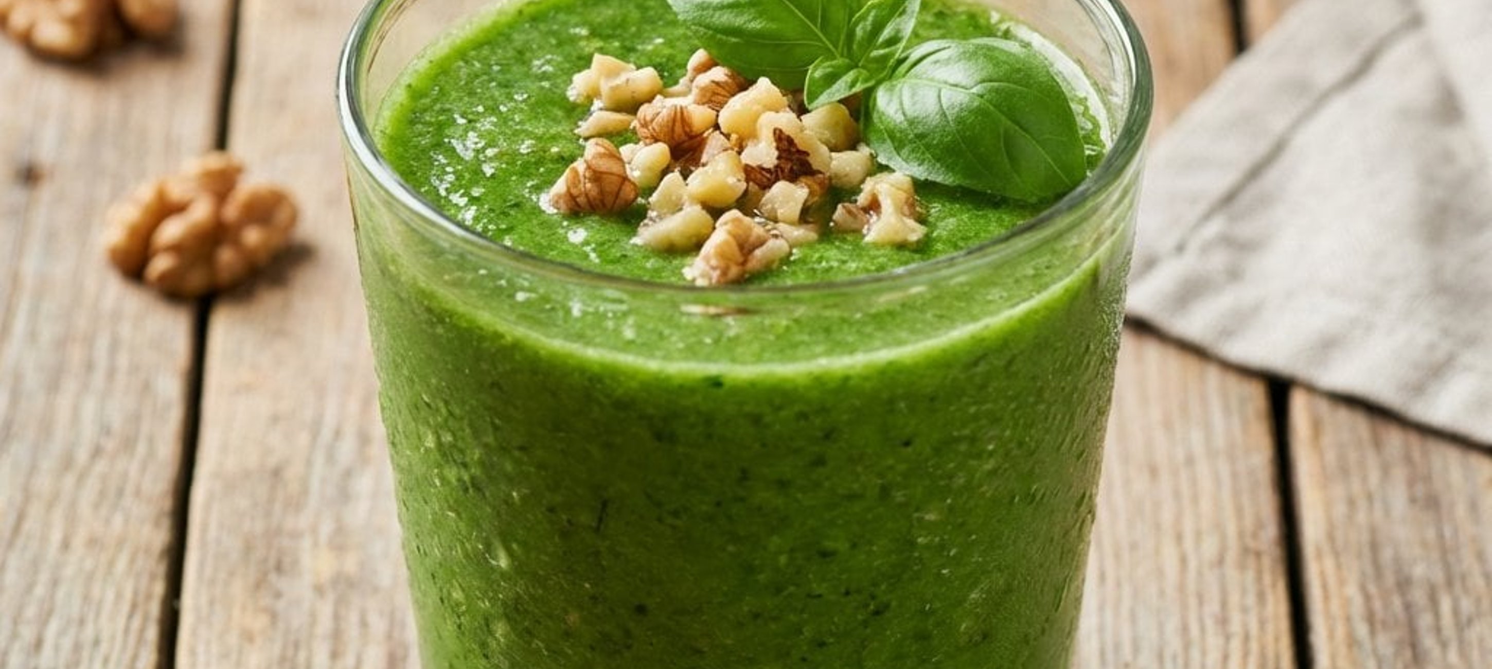 - 4Den Smoothie auf 4 Gläser verteilen. Mit frischen Basilikumblättern und den restlichen, grob gehackten Walnüssen garnieren und sofort genießen.