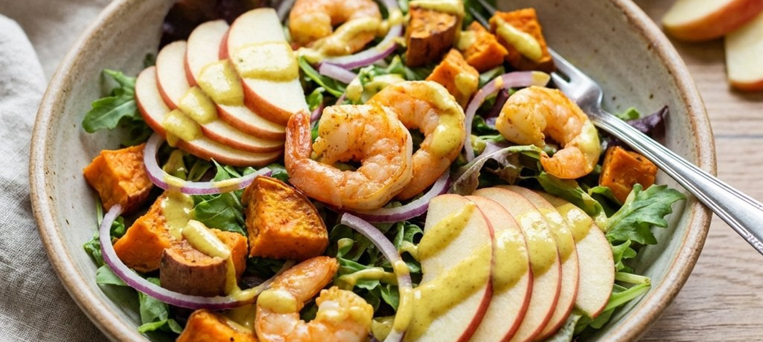 - 4Schneiden Sie die Äpfel in Spalten und beträufeln Sie diese sofort mit Zitronensaft, damit sie nicht braun werden. Mischen Sie in einer großen Schüssel die Salatmischung mit den gehackten Kräutern (Petersilie und Minze), den gerösteten Süßkartoffeln und den Apfelspalten. Richten Sie den Salat mit den Garnelen an und träufeln Sie das Curry-Dressing darüber. Mit Radieschensprossen garniert servieren.