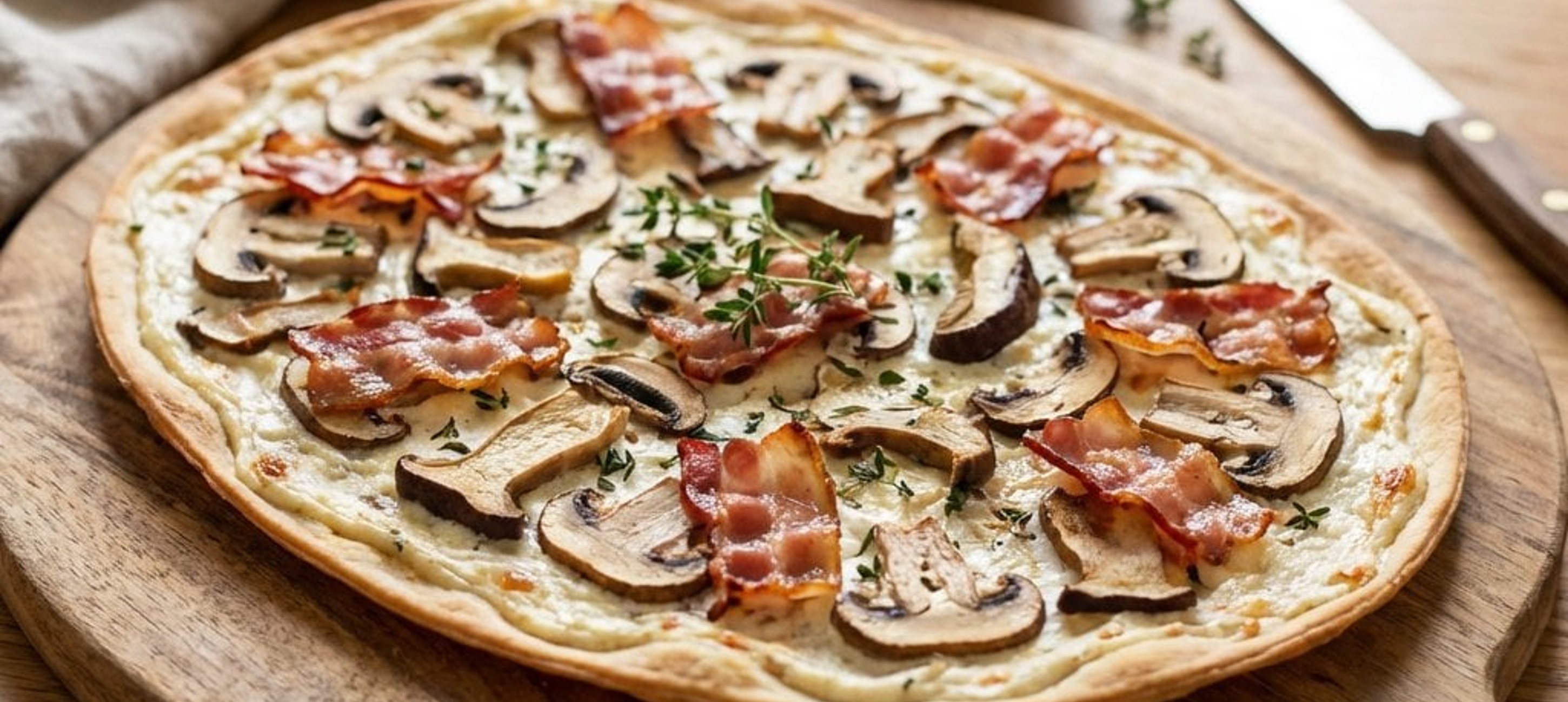 Tipp: Für einen besonders authentischen Geschmack können Sie auch etwas Kümmel in den Teig oder über den Belag geben. Servieren Sie den Flammkuchen am besten auf einem Holzbrett!