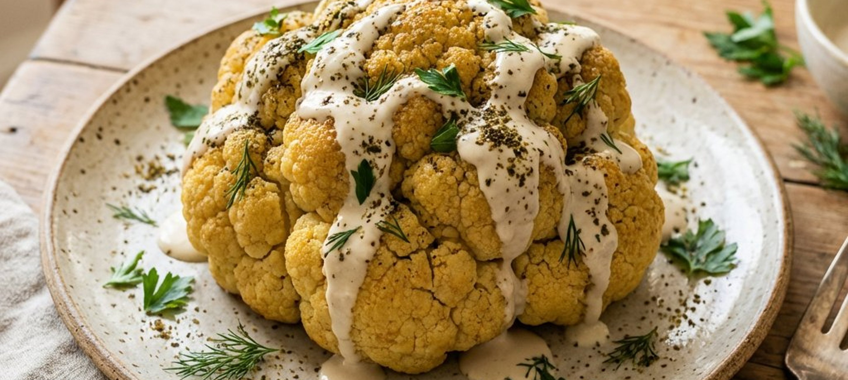 - 2Den Karfiolkopf großzügig mit Olivenöl bestreichen, mit Za'atar und einer Prise Salz bestreuen. Etwa 100 ml Wasser in die Form gießen, den Karfiol fest mit Alufolie abdecken und für 30–35 Minuten im Ofen garen. Danach die Folie entfernen, erneut mit etwas Olivenöl bestreichen und offen weitere 5 Minuten goldbraun rösten.