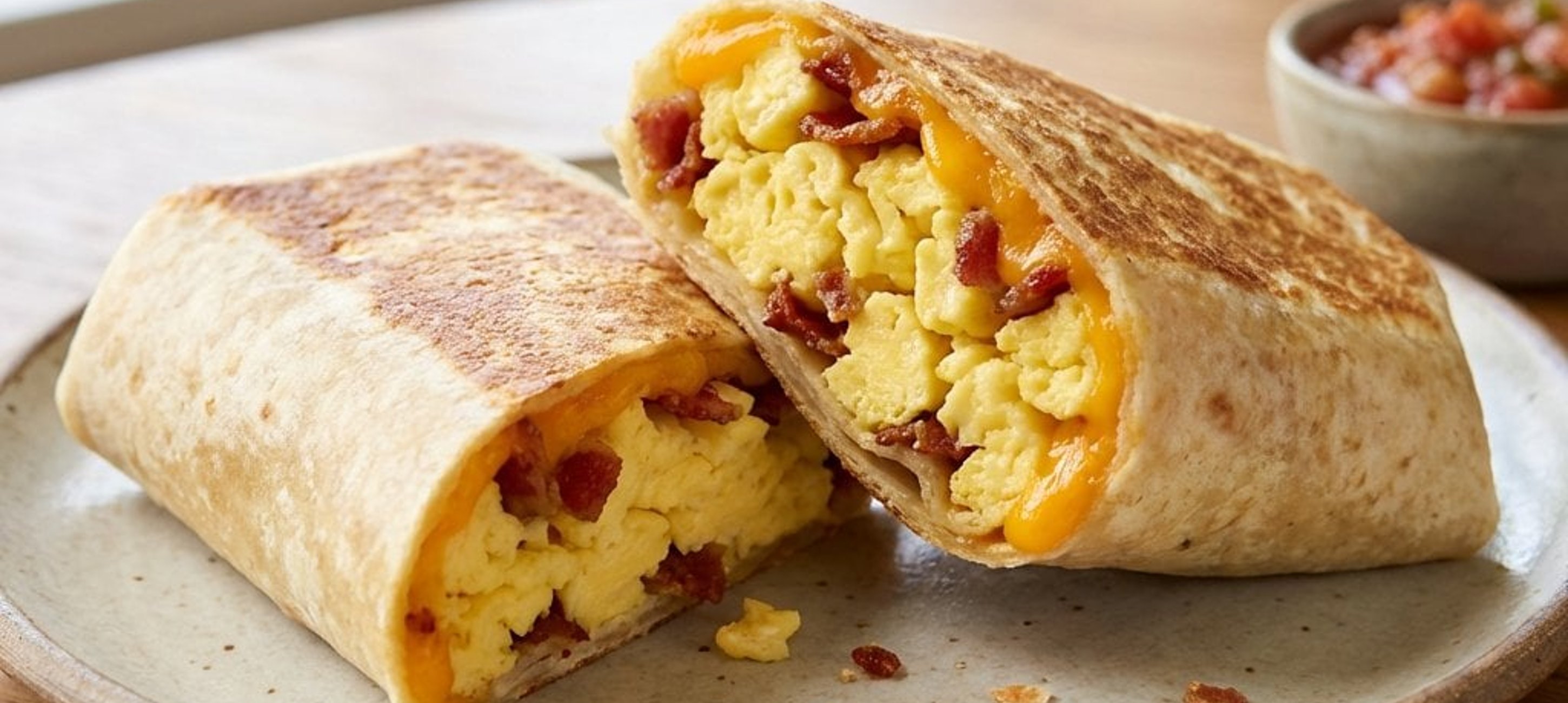 - 3Die Speck-Zwiebel-Mischung mit den verquirlten Eiern übergießen, sodass die Masse die Größe der Tortilla hat. Etwa 10–20 Sekunden stocken lassen, dann die Tortilla darauflegen und leicht andrücken, damit sie an den Eiern haftet. Nach weiteren 10 Sekunden die Tortilla vorsichtig wenden, sodass die Eierseite oben liegt. Mit dem geriebenen Gouda bestreuen. Sobald der Käse geschmolzen ist, den Wrap eng einrollen und warm servieren.