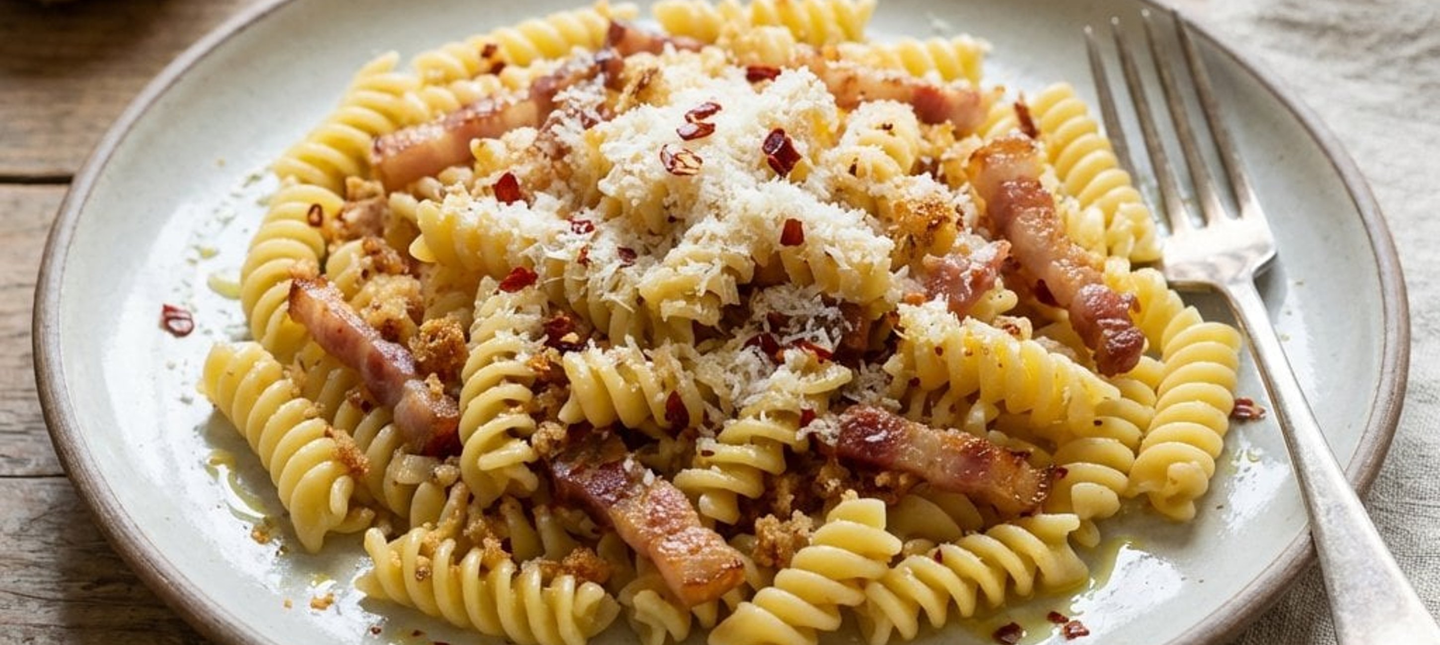 - 2Nun die Chiliflocken, die Semmelbrösel und die in feine Streifen geschnittene Pancetta in die Pfanne geben. Alles kurz anrösten, bis die Brösel goldbraun sind und sich die Aromen wunderbar verbunden haben.
