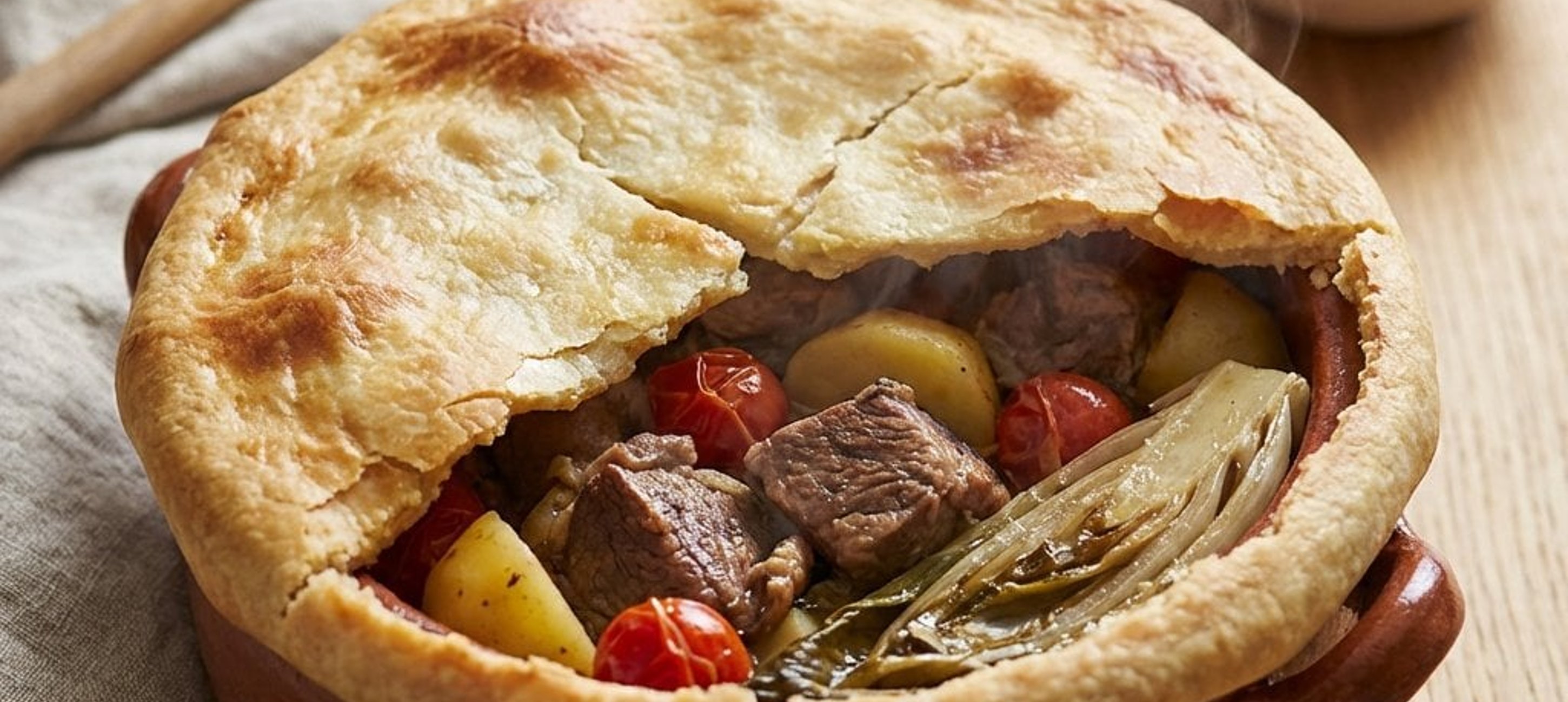 - 1Verwenden Sie für dieses Gericht am besten einen Tontopf oder einen gusseisernen Schmortopf. Das Lammfleisch in mundgerechte Stücke schneiden, in den Topf geben und leicht salzen. Na maso postupně vrstvíme další suroviny – cibuli pokrájenou na měsíčky, na kostky nakrájený sýr ovčí pecorino i s kůrou, na půlky pokrájená cherry rajčátka, oloupanou a na kostky pokrájenou bramboru, čerstvé listy čekanky. V hrnci zlehka upěchujeme, dosolíme, opepříme a přidáme i semínka fenyklu. Podlijeme asi 2 dcl vody. Pečeme ve vyhřáté troubě 180°C po dobu 3 hodin pod běžnou poklicí. Mezitím připravíme těsto. Posledních 15 minut vyměníme hliněnou poklici za poklici z těsta. Těsto položíme na hrnec, po okrajích přimáčkneme po celém obvodu k hrnci tak, aby těsto dobře přilnulo a z hrnce neutíkala pára. Po dopečení a vyjmutí z trouby nejprve rozřízneme upečenou pokličku a servírujeme naběračkou do hlubokých talířů.