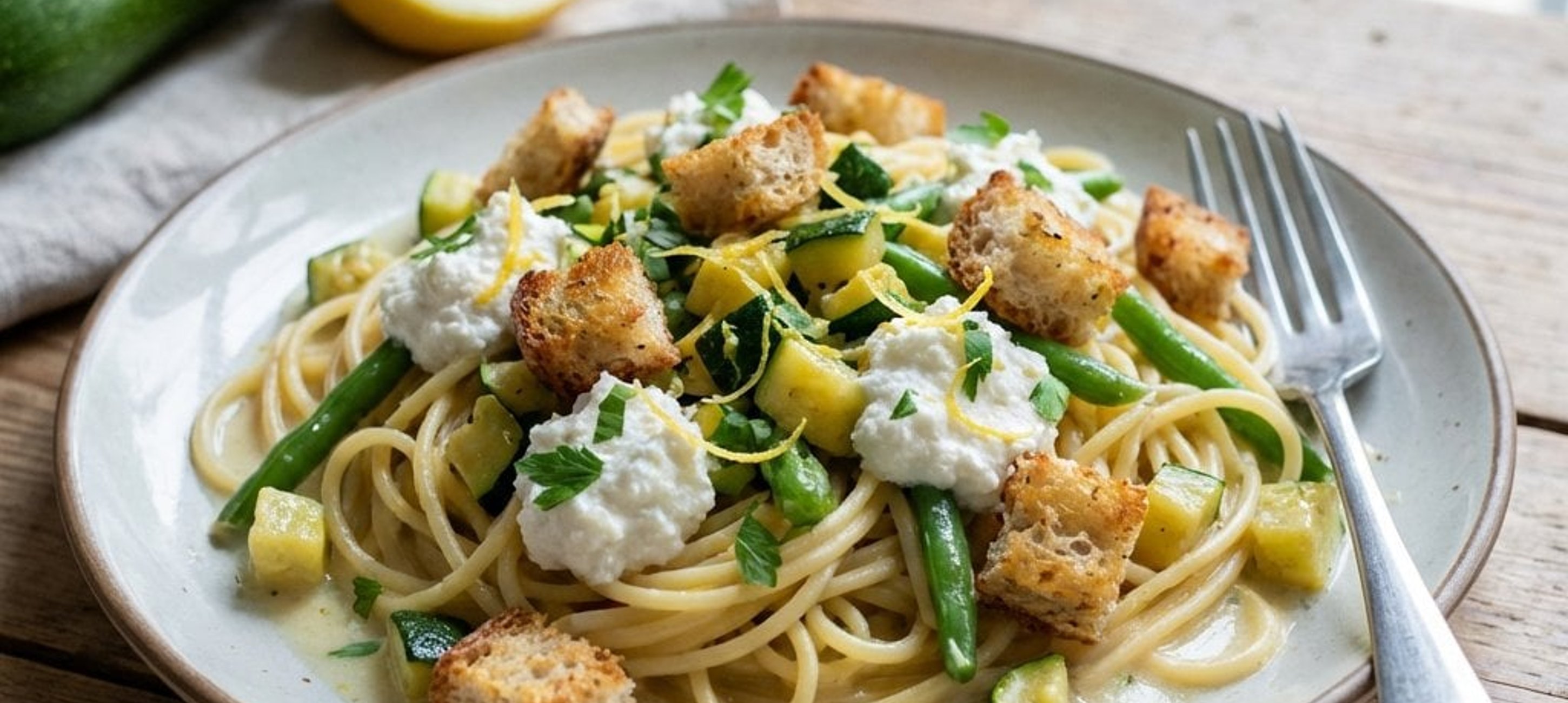 - 1Alles gut durchschwenken. Den restlichen frischen Ricotta, Olivenöl, die knusprigen Croutons und frische Zitronenschale hinzufügen. Mit gezupftem Basilikum garnieren und servieren.