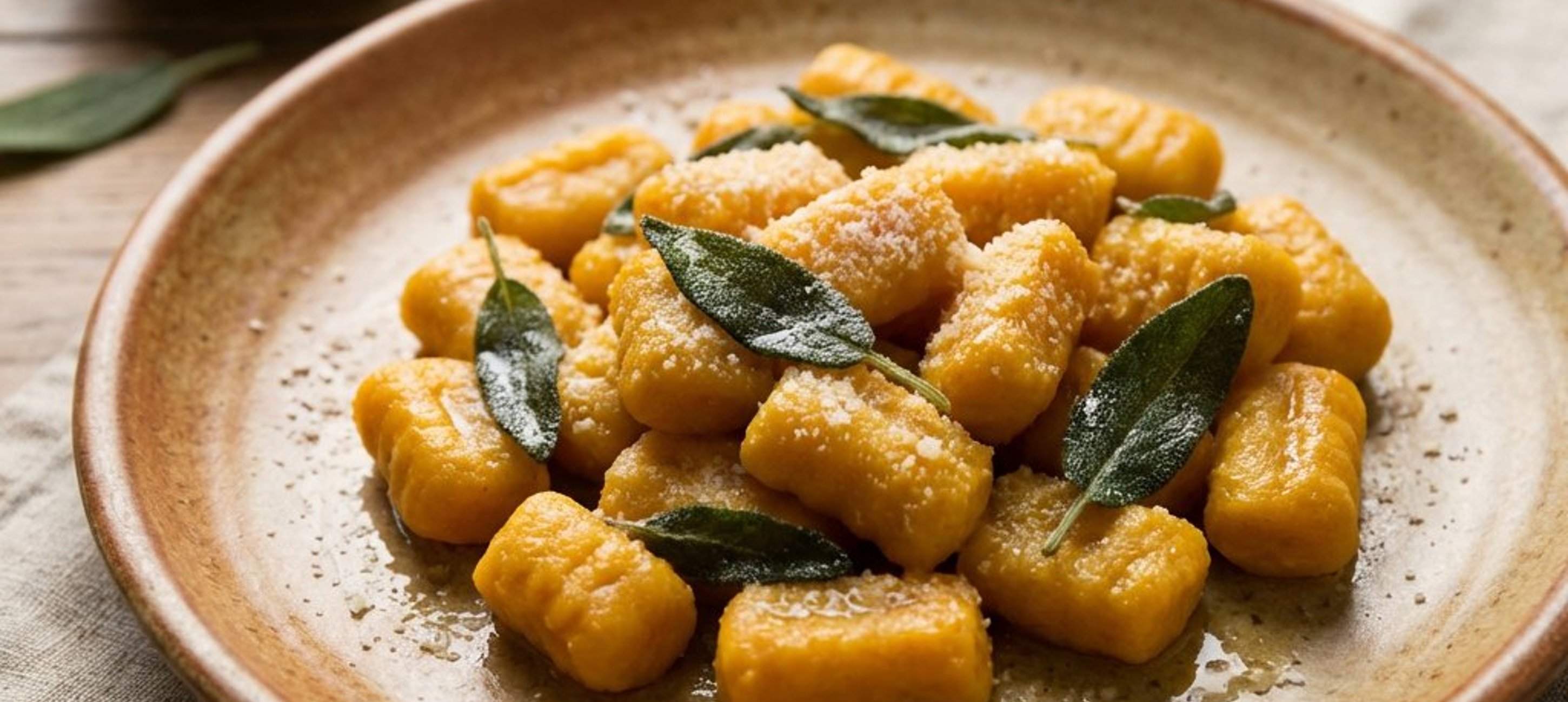 - 1Den Kürbis fein pürieren. Das Püree mit dem Ei, dem Dinkelmehl, dem fein geriebenen Parmesan und dem Salz zu einem kompakten Teig verkneten. Die Arbeitsfläche mit Mehl bestäuben. Den Teig in mehrere Portionen teilen, zu Rollen formen und in kleine Stücke schneiden. Bei Bedarf noch etwas Mehl hinzufügen, damit der Teig nicht klebt. Die Teigstücke mit der Rückseite einer Gabel leicht eindrücken, um das typische Gnocchi-Muster zu erhalten.