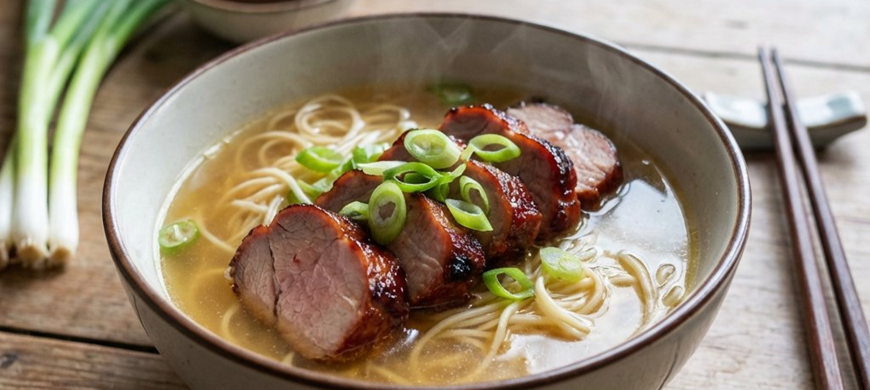 Servieren Sie das aufgeschnittene Fleisch in einer kräftigen Hühnersuppe mit Eiernudeln und frischen Jungzwiebeln für eine authentische Char-Siu-Nudelsuppe.