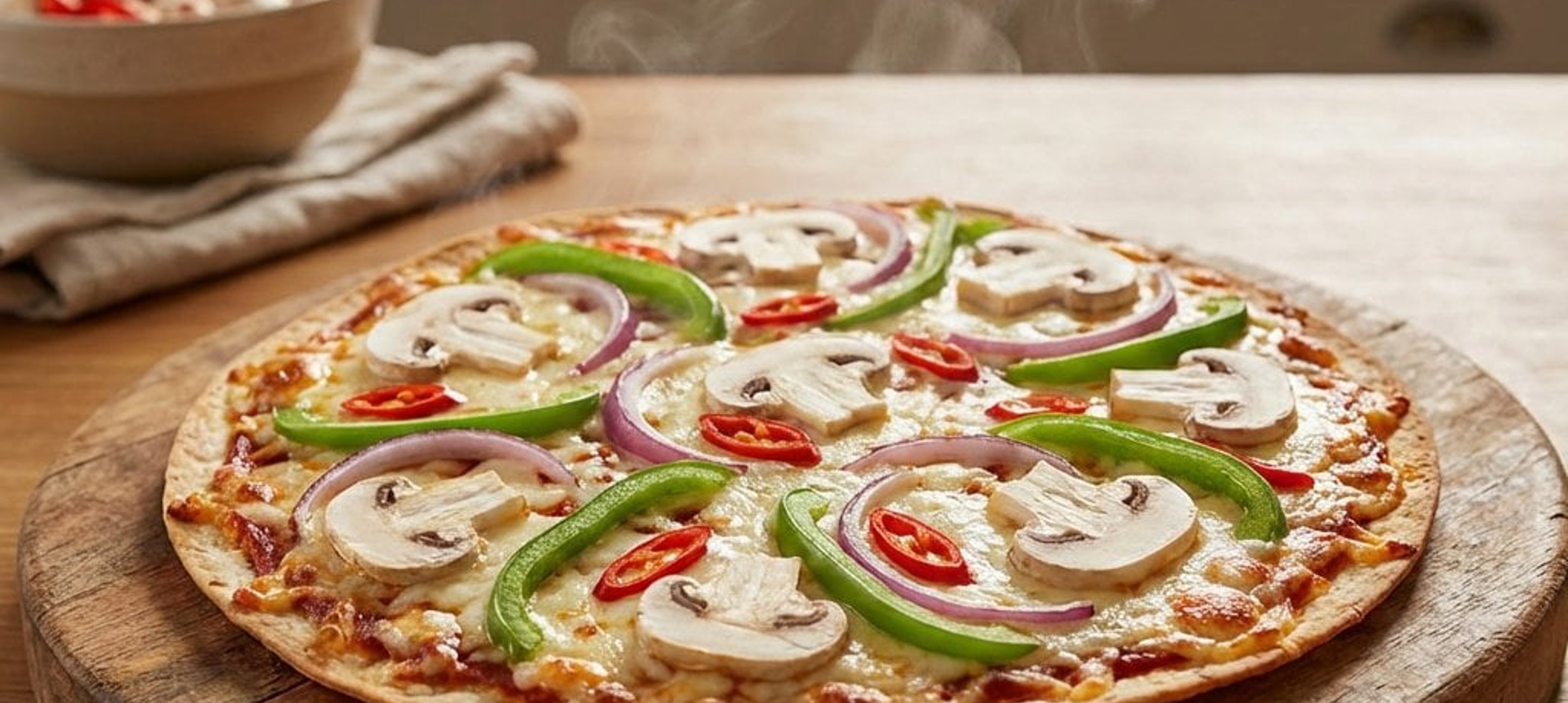 - 4Die Tortilla-Pizza aus der Pfanne nehmen und auf ein mit Backpapier belegtes Blech legen. Die Oberseite großzügig mit der vorbereiteten Sauce bestreichen. Mit Mozzarella, Champignons, Zwiebelringen, Paprikastreifen und Chiliringen belegen. Im vorgeheizten Ofen ca. 5 Minuten backen, bis der Käse goldgelb geschmolzen ist. Heiß servieren!