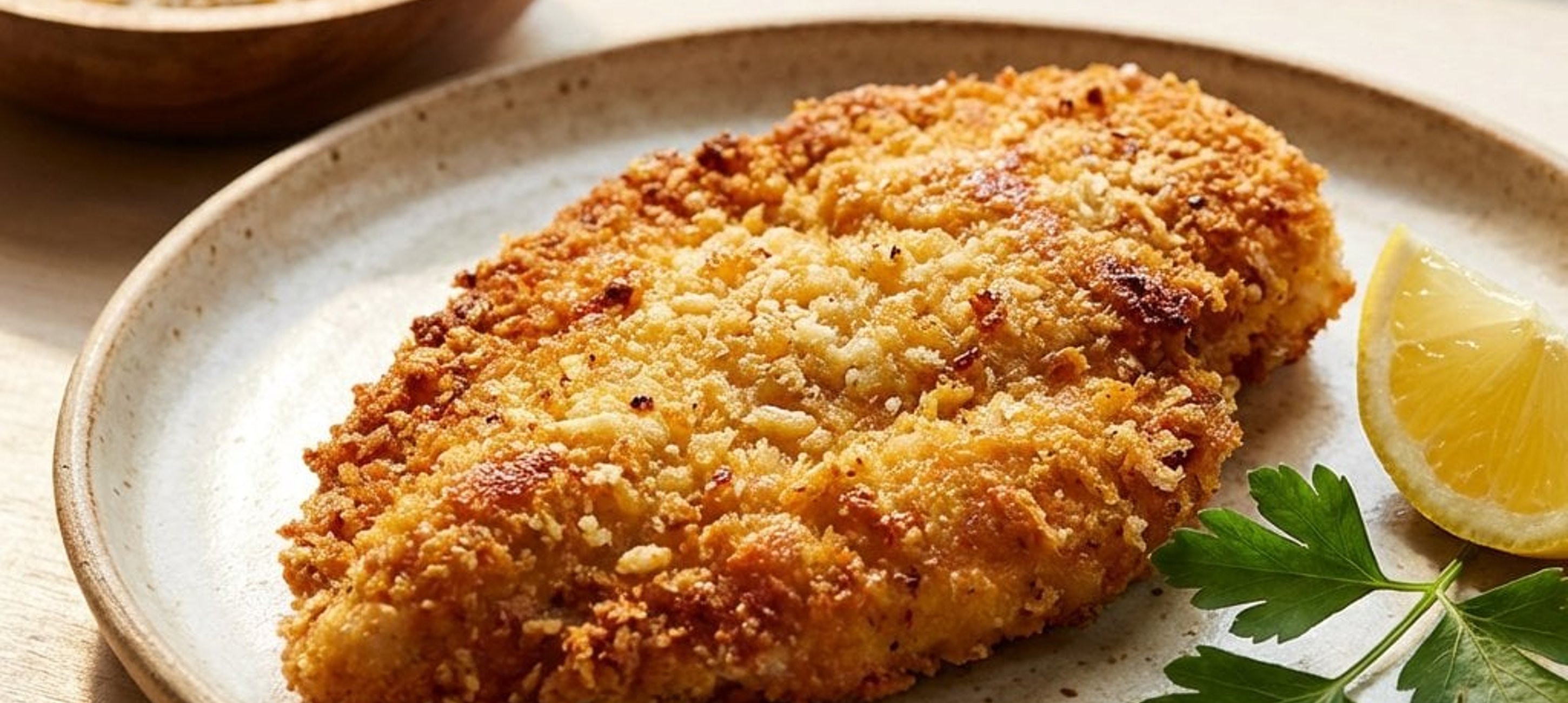 - 2Die Panierstation vorbereiten: Drei tiefe Teller bereitstellen. In den ersten Teller das Mehl mit 1/2 TL Salz, Pfeffer und dem Paprikapulver mischen. Im zweiten Teller das Ei mit der Milch und einer Prise Salz verquirlen. Im dritten Teller die Semmelbrösel mit dem fein geriebenen Parmesan vermengen.