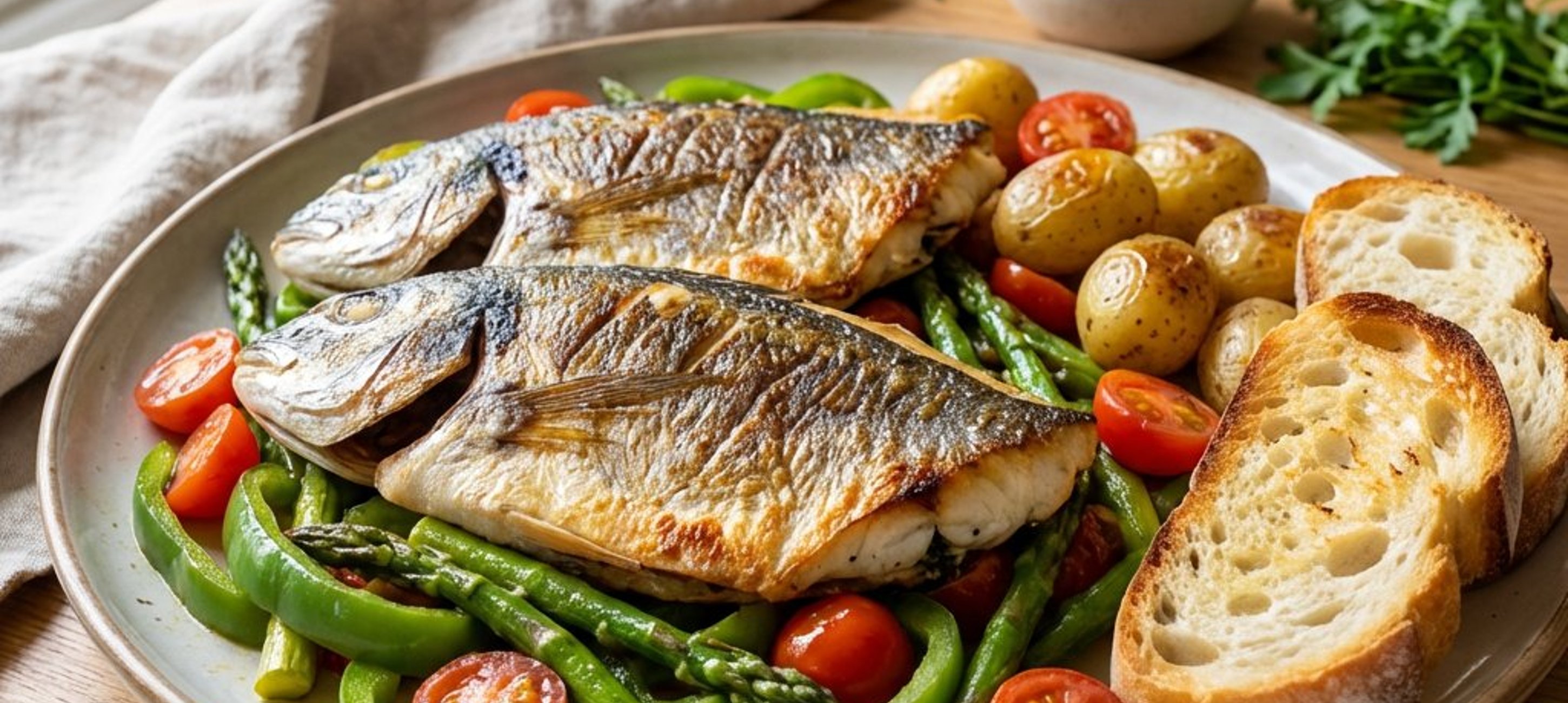 - 7Das italienische Weißbrot (Ciabatta) trocken von beiden Seiten anrösten. Den Fisch darauf anrichten und mit dem Gemüse sowie dem Saft aus der Pfanne garnieren.