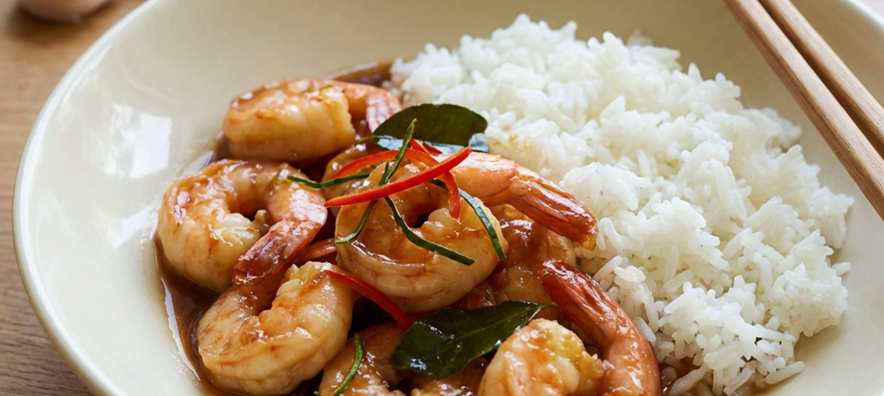 - 3Servieren: Die Garnelen heiß zusammen mit frisch gekochtem Jasminreis servieren.