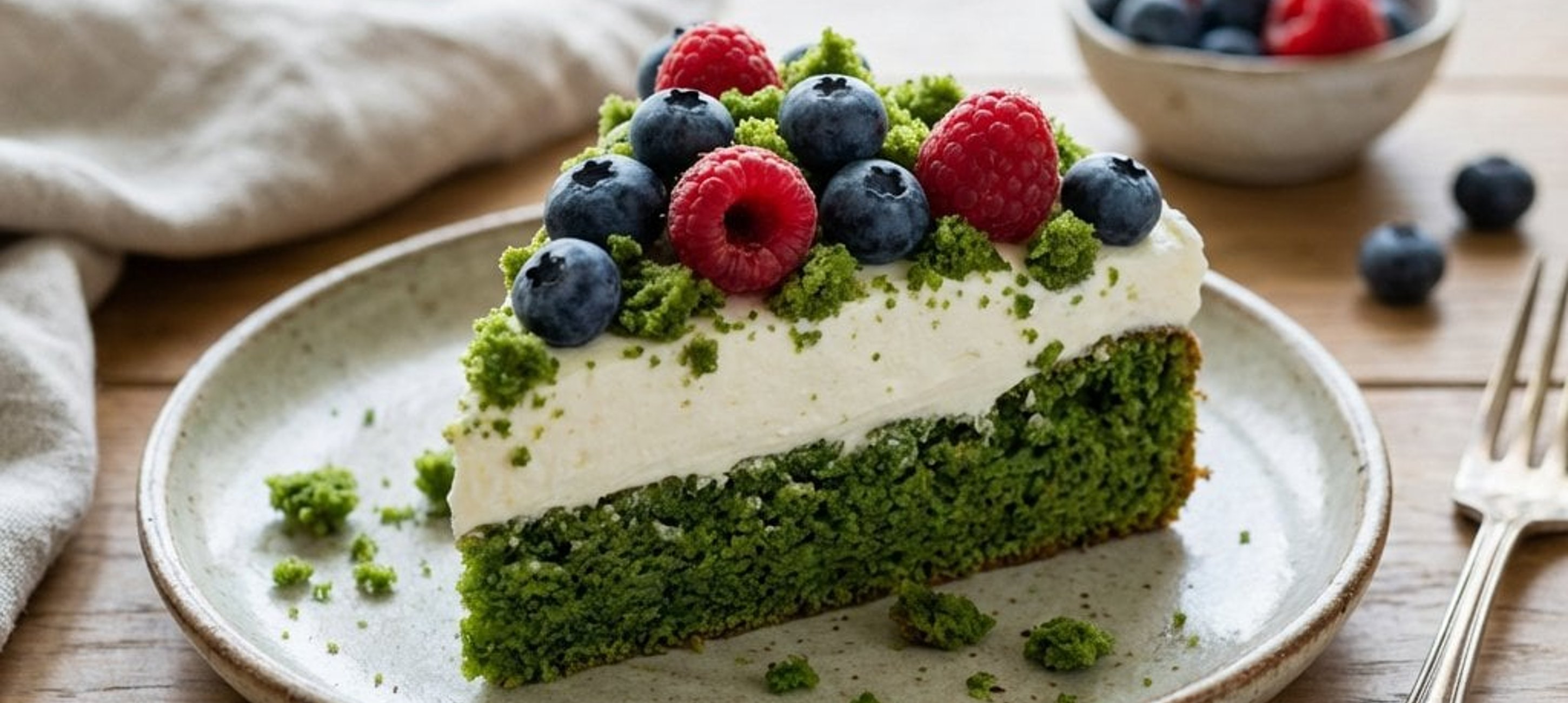 - 4300 g glattes Weizenmehl mit 12 g Backpulver mischen, über die Masse sieben und behutsam unterheben, bis ein gleichmäßiger grüner Teig entsteht.