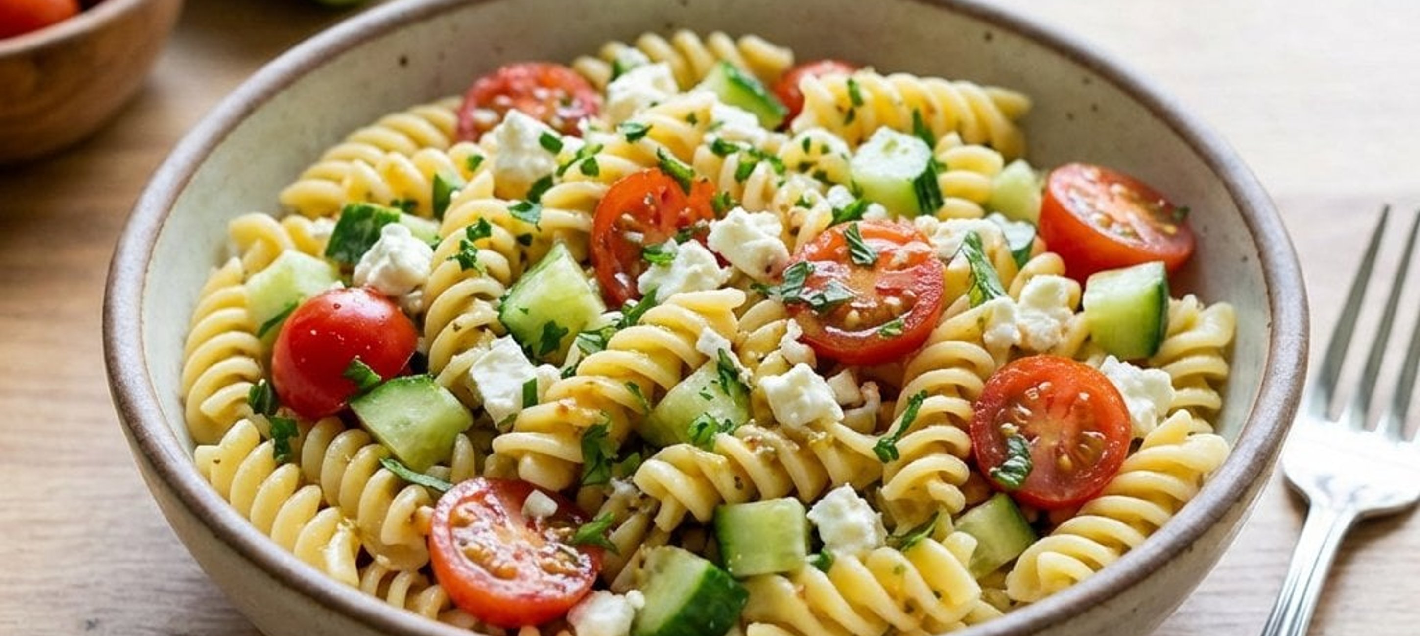 - 4Die abgekühlten Nudeln zum Gemüse in die Schüssel geben und mit dem Dressing übergießen. Alles gut vermengen.