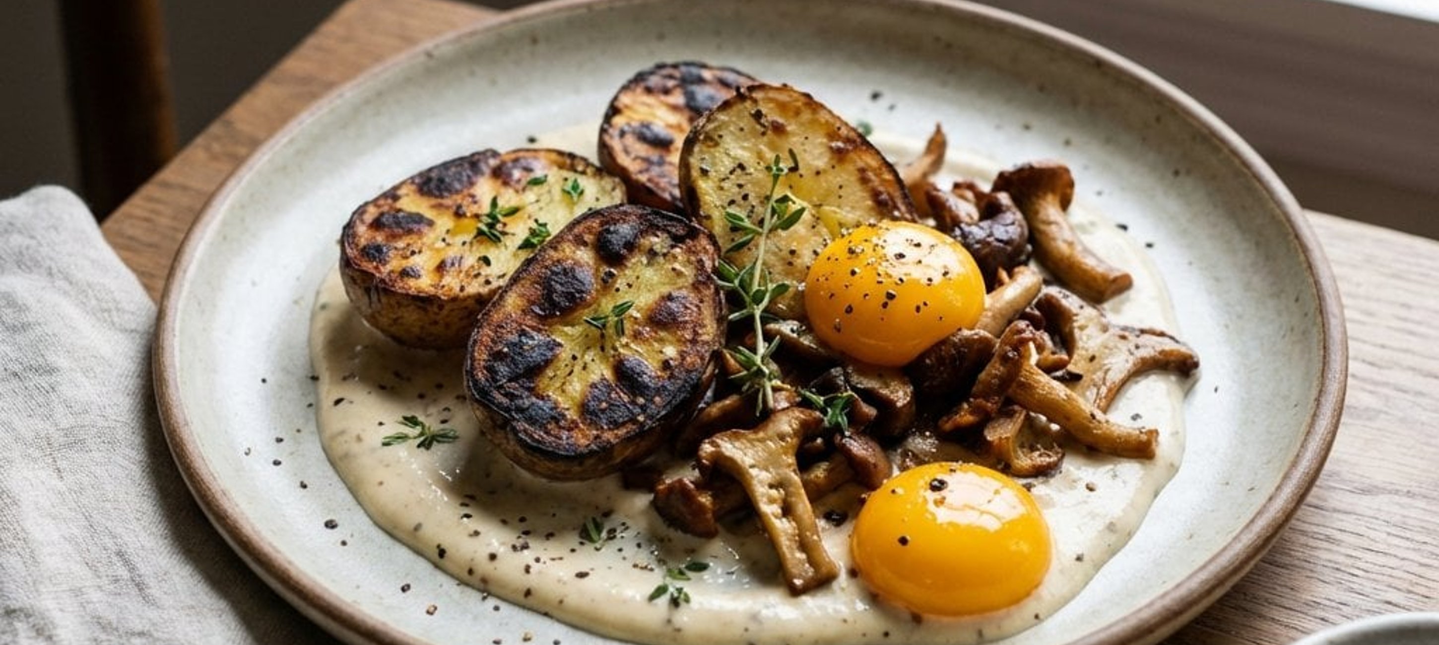 - 1Schnittlauch fein schneiden. Zuerst die warme Knoblauchsauce auf die Teller verteilen. Die Asche-Erdäpfel hineinsetzen und mit Meersalzflocken bestreuen. Die gebratenen Pilze und die marinierten Eidotter (in Viertel geschnitten) darauf verteilen. Mit Schnittlauch und nach Belieben mit Grammeln, weißem Pfeffer und Trüffelöl garnieren.