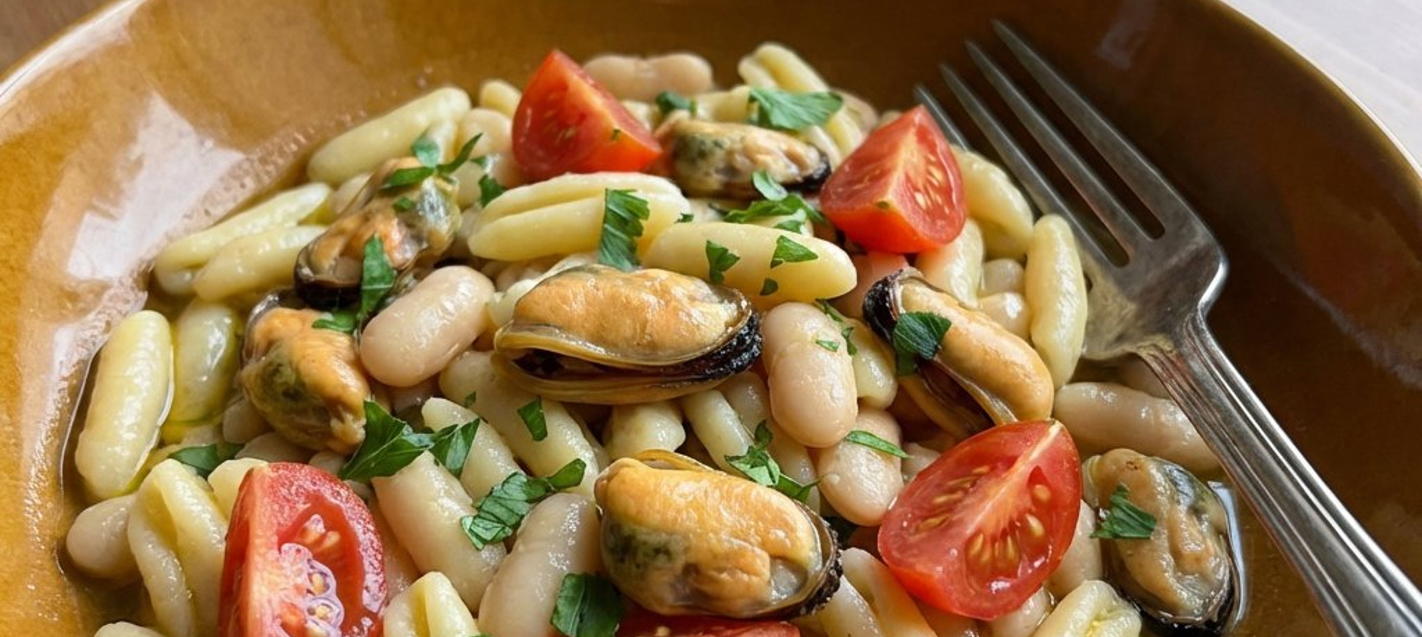 - 3Die Kirschtomaten vierteln und zusammen mit den vorbereiteten Bohnen zu den Muscheln geben. Alles 2–3 Minuten köcheln lassen. Die Pasta hinzufügen, bei Bedarf etwas Nudelwasser unterrühren und alles gut vermengen. Mit Pfeffer und einem Schuss frischem Olivenöl abschmecken. In tiefen Tellern servieren.