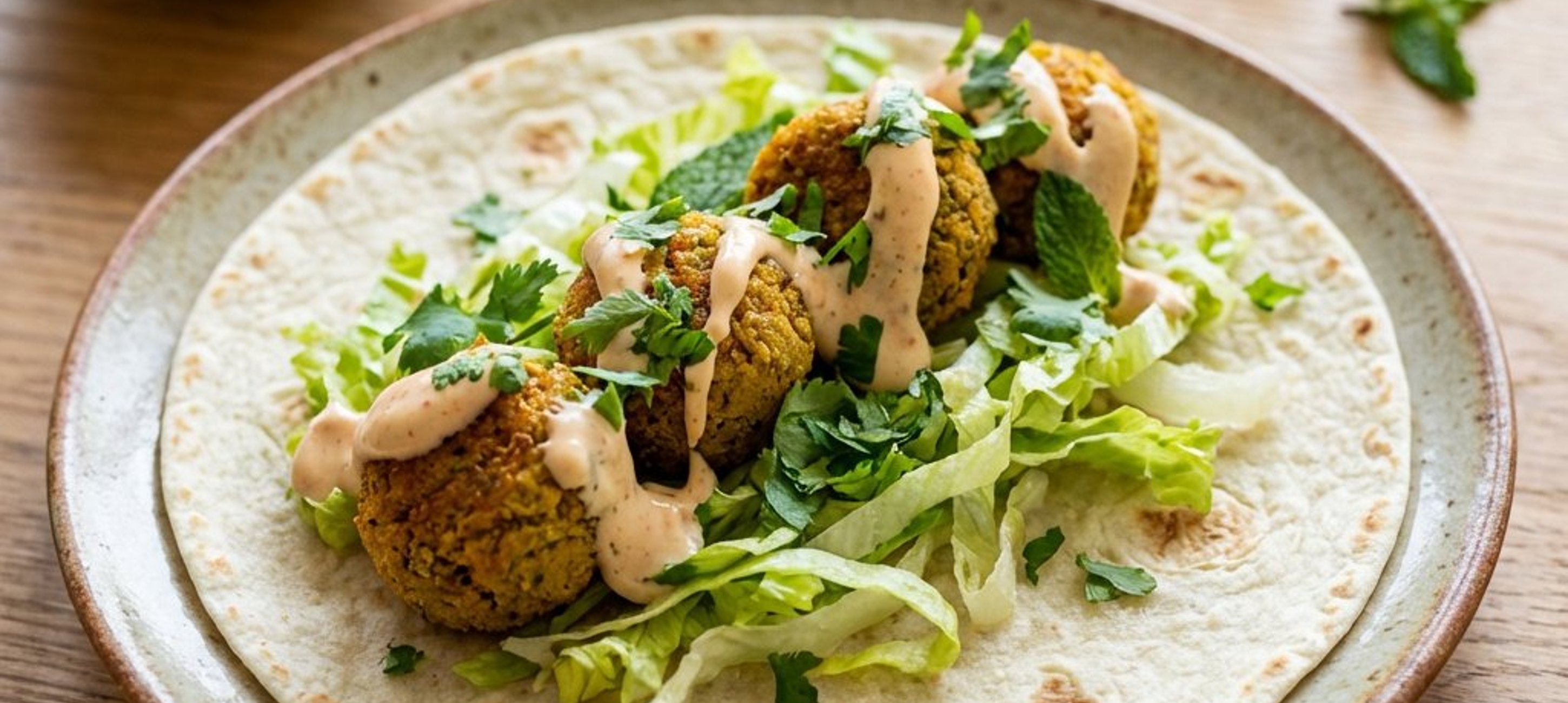 - 8Die Tortillas leicht biegen, mit Salatblättern und Falafel-Bällchen füllen und großzügig mit der Chili-Limetten-Mayonnaise beträufeln. Sofort servieren.