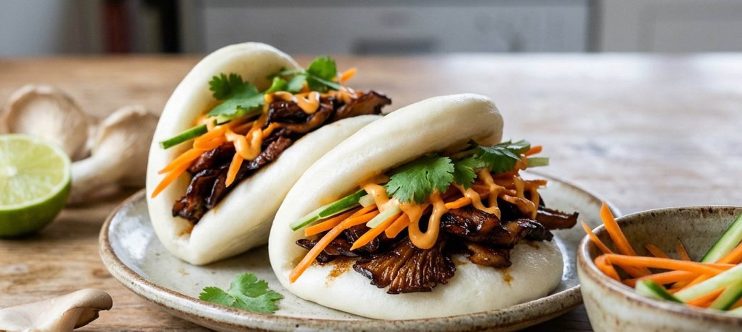 - 2Die gedämpften Bao Buns vorsichtig öffnen, mit den knusprigen Pilzen, dem Salat und frischem Koriander füllen. Mit etwas Limettensaft beträufeln und mit der Sriracha-Mayonnaise (Sriracha mit Mayo vermischt) garnieren. Heiß servieren!