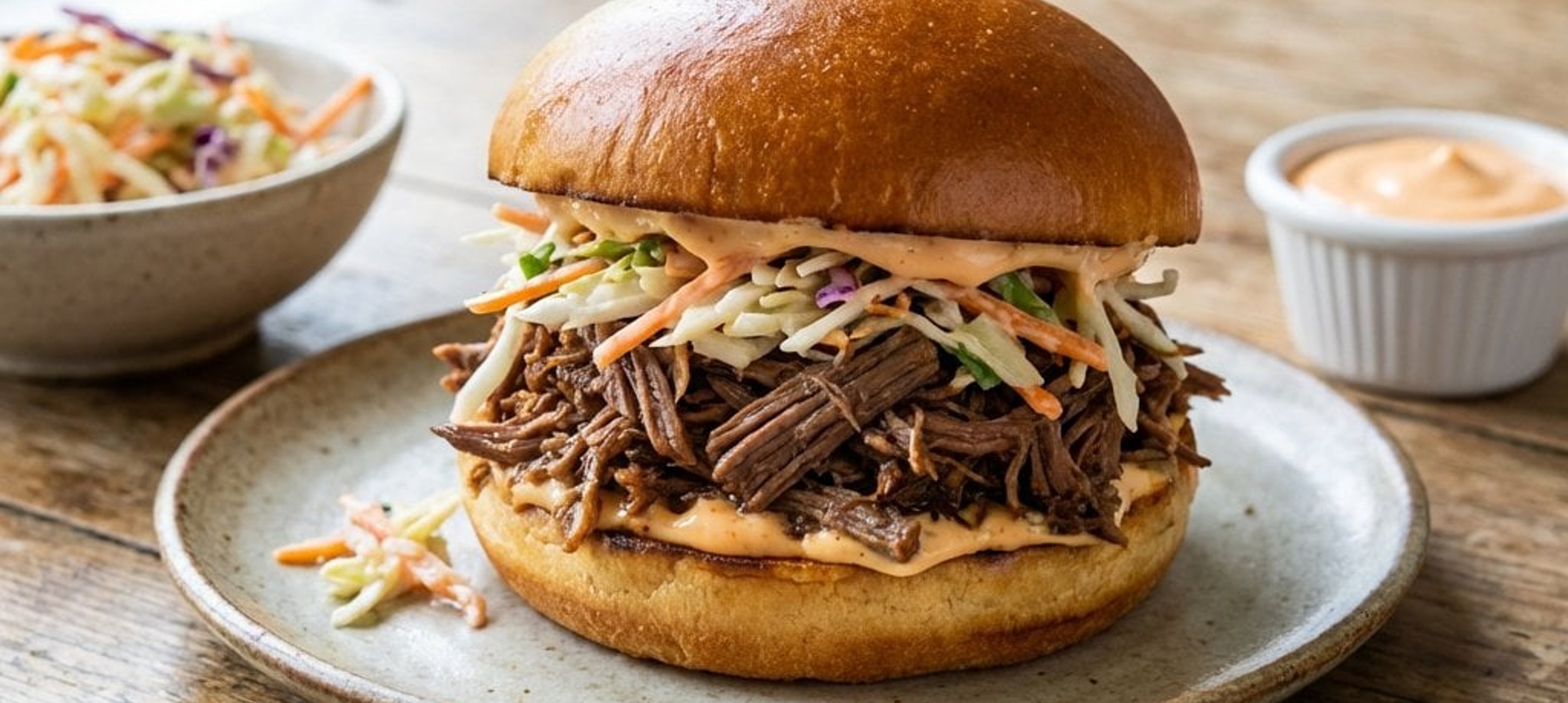 - 3Die unteren Hälften der Brötchen großzügig mit der Sriracha-Mayo bestreichen. Das warme Fleisch darauf verteilen und mit einer ordentlichen Portion Coleslaw toppen. Die oberen Brötchenhälften aufsetzen und sofort servieren.