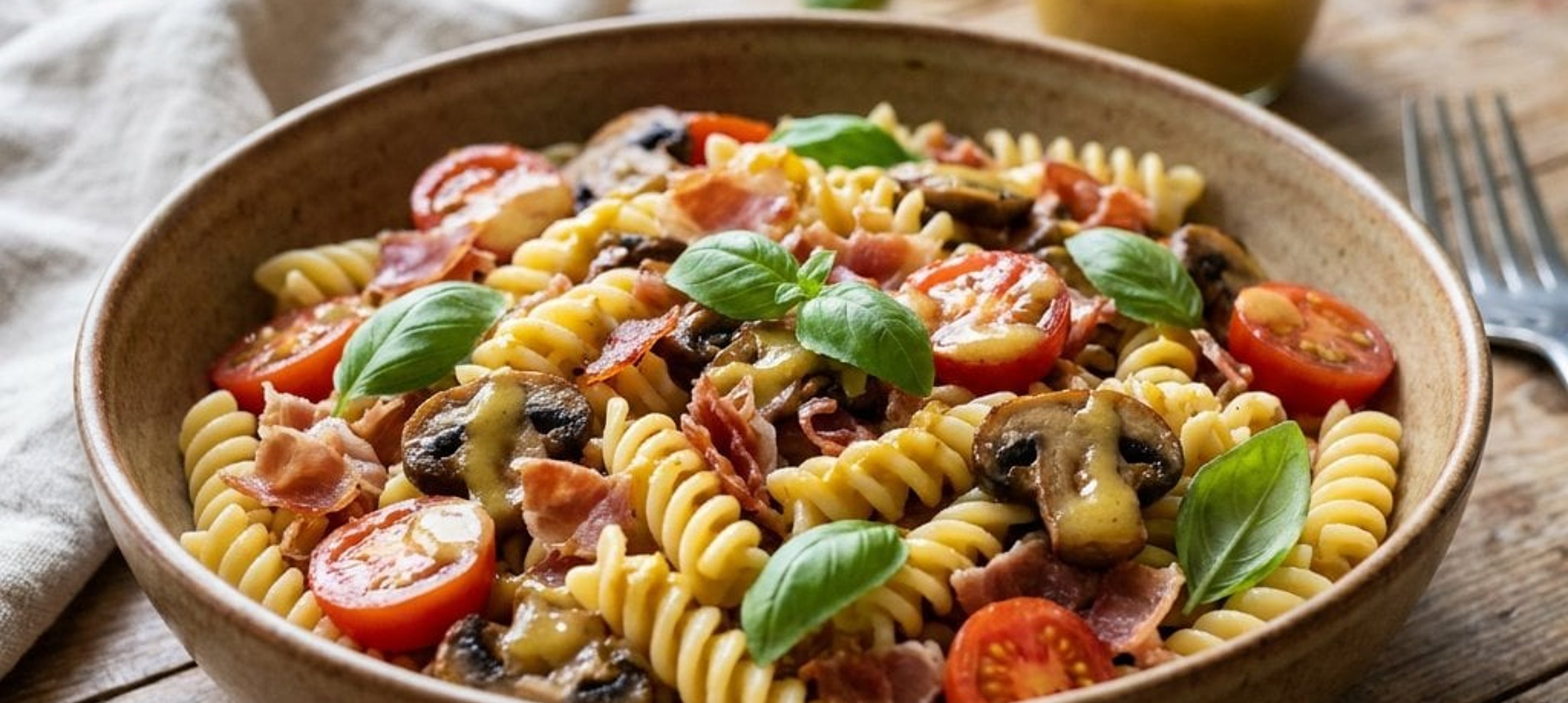 - 7Zum Schluss den gebratenen Prosciutto und die Champignons unterheben. Mit frisch gemahlenem Pfeffer und bei Bedarf einer Prise Salz abschmecken.