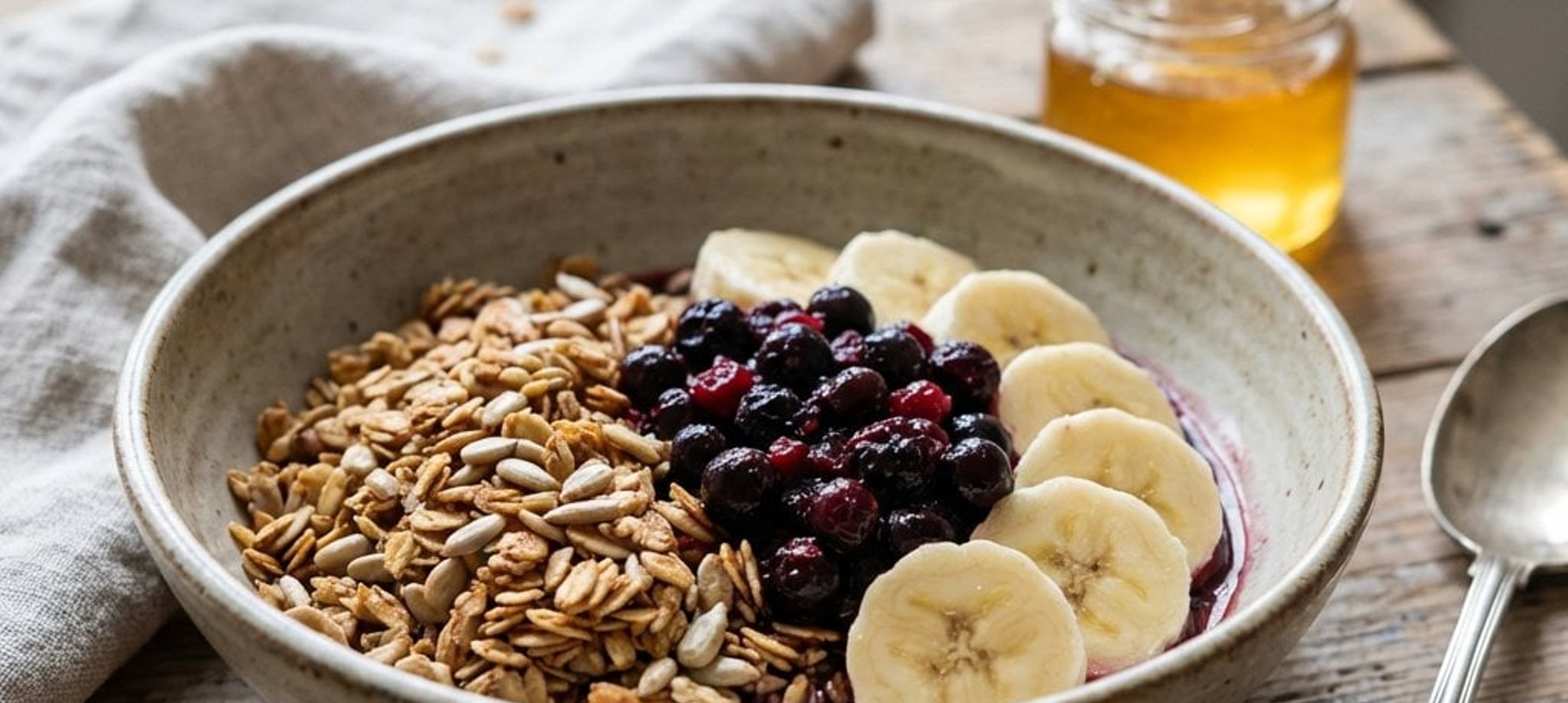 - 4Während die Granola im Ofen ist, die gefrorenen Beeren in einen Topf geben und aufkochen. Die Hitze reduzieren und ca. 8–10 Minuten köcheln lassen. In der Zwischenzeit die Bananen mit einer Gabel zerdrücken, zu den Beeren geben und weitere 5 Minuten köcheln, bis die gewünschte Konsistenz erreicht ist. Falls die Mischung zu dickflüssig ist, einen Schluck Wasser hinzufügen. Den Beerenröster mindestens 15 Minuten abkühlen lassen.